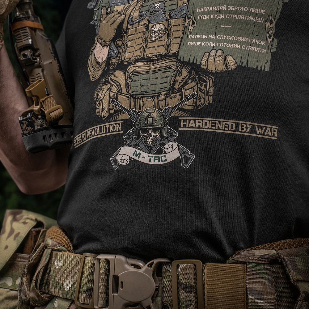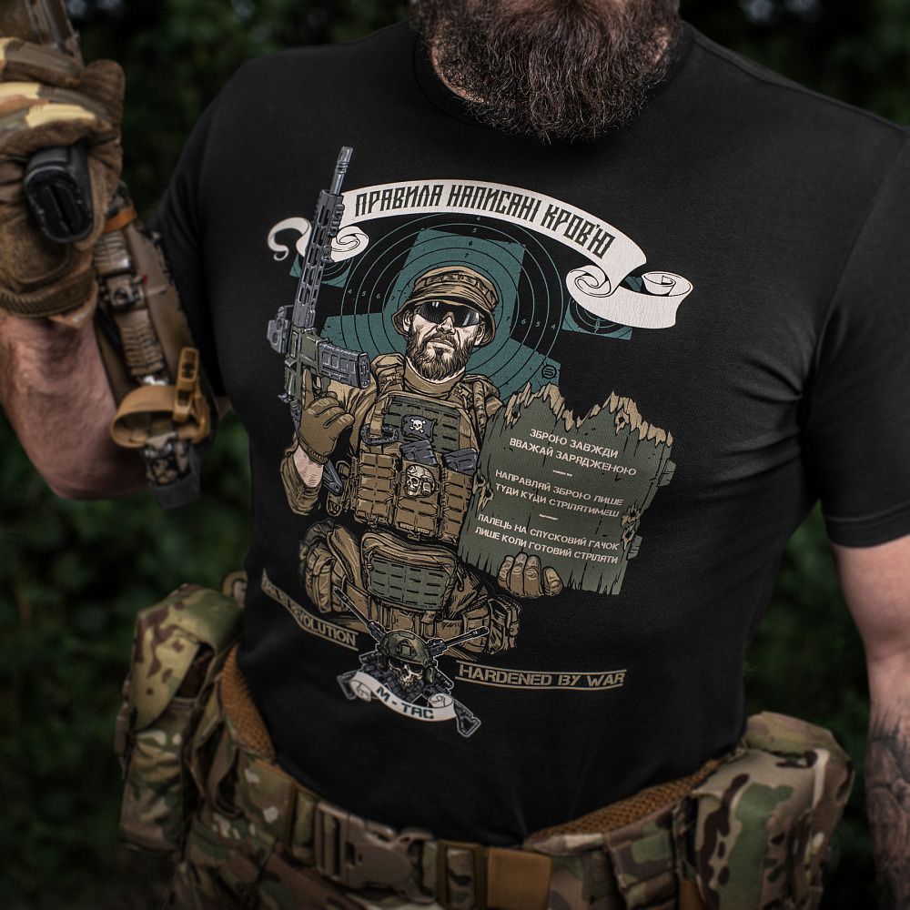Сьогодні багато майбутніх захисників України проходять вишколи на полігонах та навчання з використання вогнепальної зброї. Кожен з них має усвідомлювати, що у поводженні зі зброєю є червоні лінії, які не можна перетинати. Саме ця важлива тема, спонукала дизайнерів бренду М-Тас на створення нової футболки, присвяченої стрільцям та їх основним, непорушним заповідям.