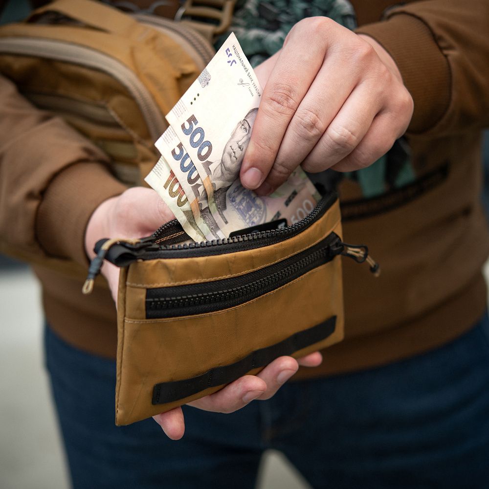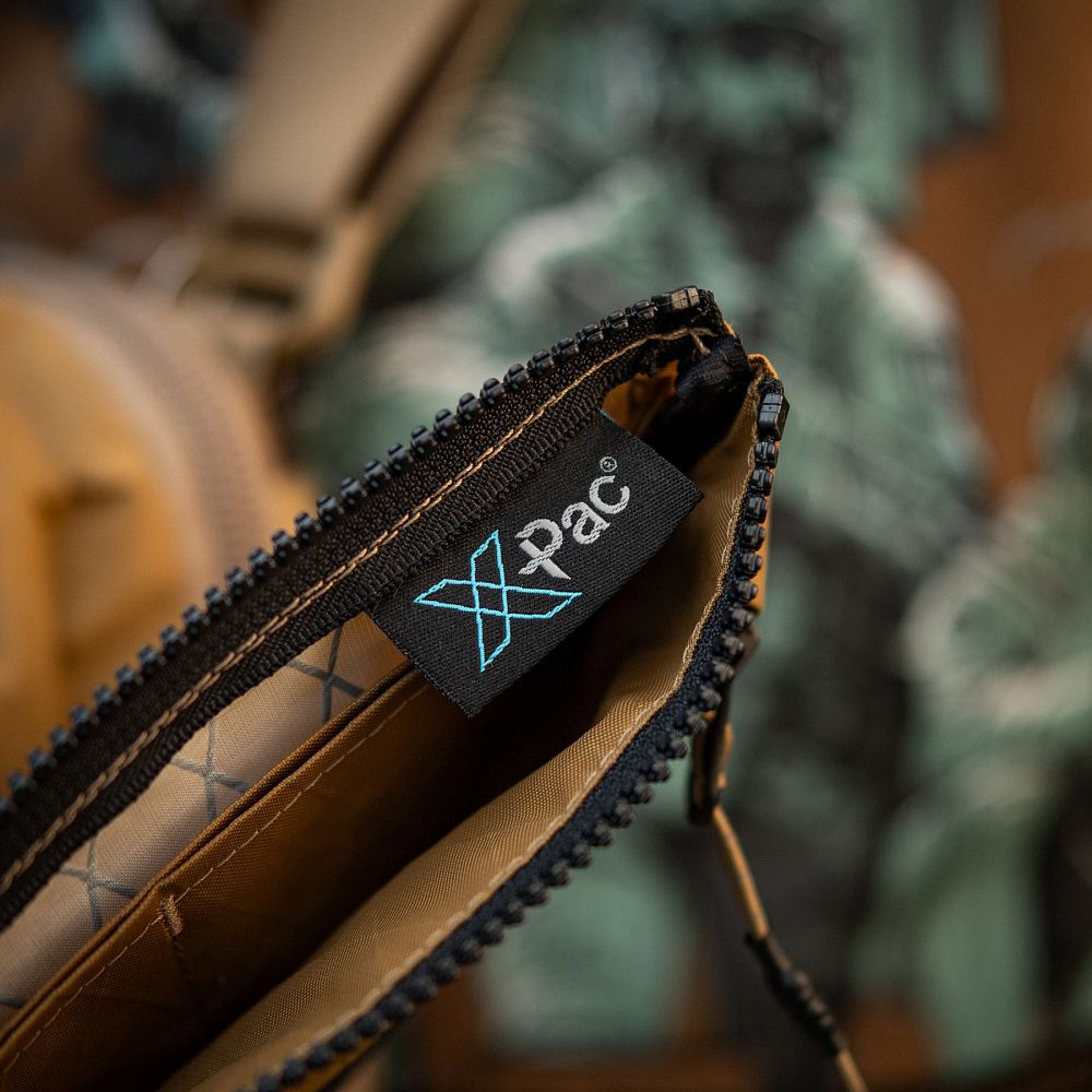 Гаманець виготовлений з інноваційного матеріалу X-PAC. Даний матеріал став широко відомим серед виробників тактичного спорядження, завдяки вдалому поєднанню міцності, невеликої ваги, стійкості до ультрафіолету та води.