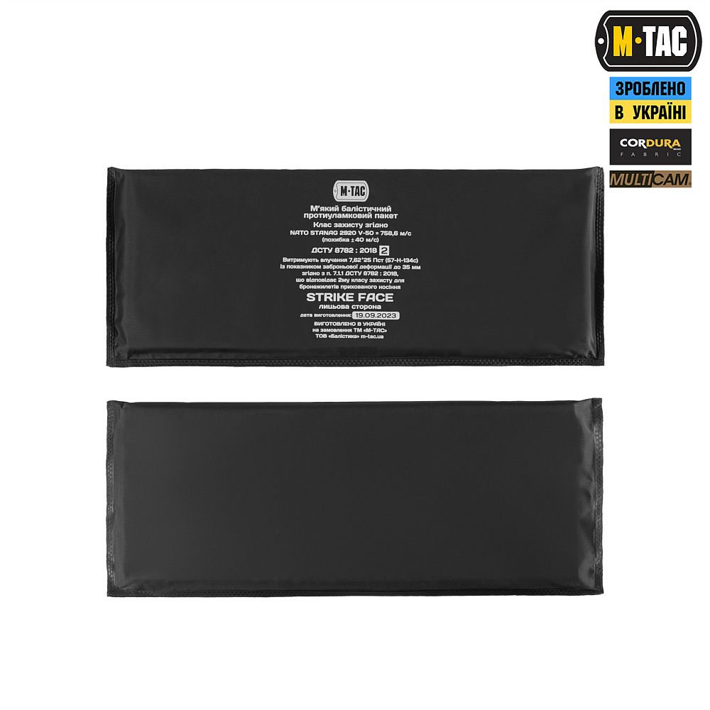 Камербанд виготовлений з Cordura 500D – надміцного матеріалу, стійкого до стирання та високих навантажень. Виріб комплектується балістичними пакетами 2-го класу, що захищають від рикошетів і уламків. Вони виготовлені з надвисокомолекулярного поліетилену (НВМПЕ) та відповідає NATO STANAG 2920 з показником протиуламкової стійкості V-50 = 758.6 м/с (похибка ± 40м/с).