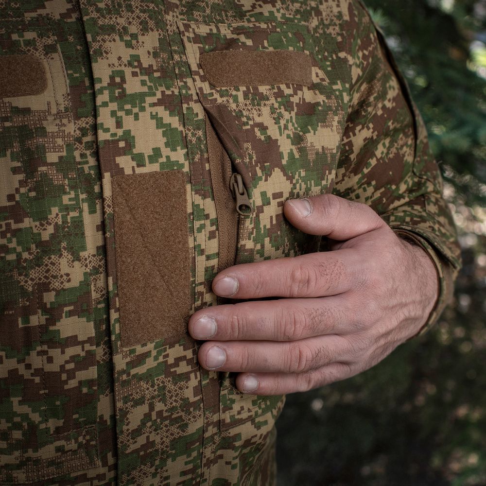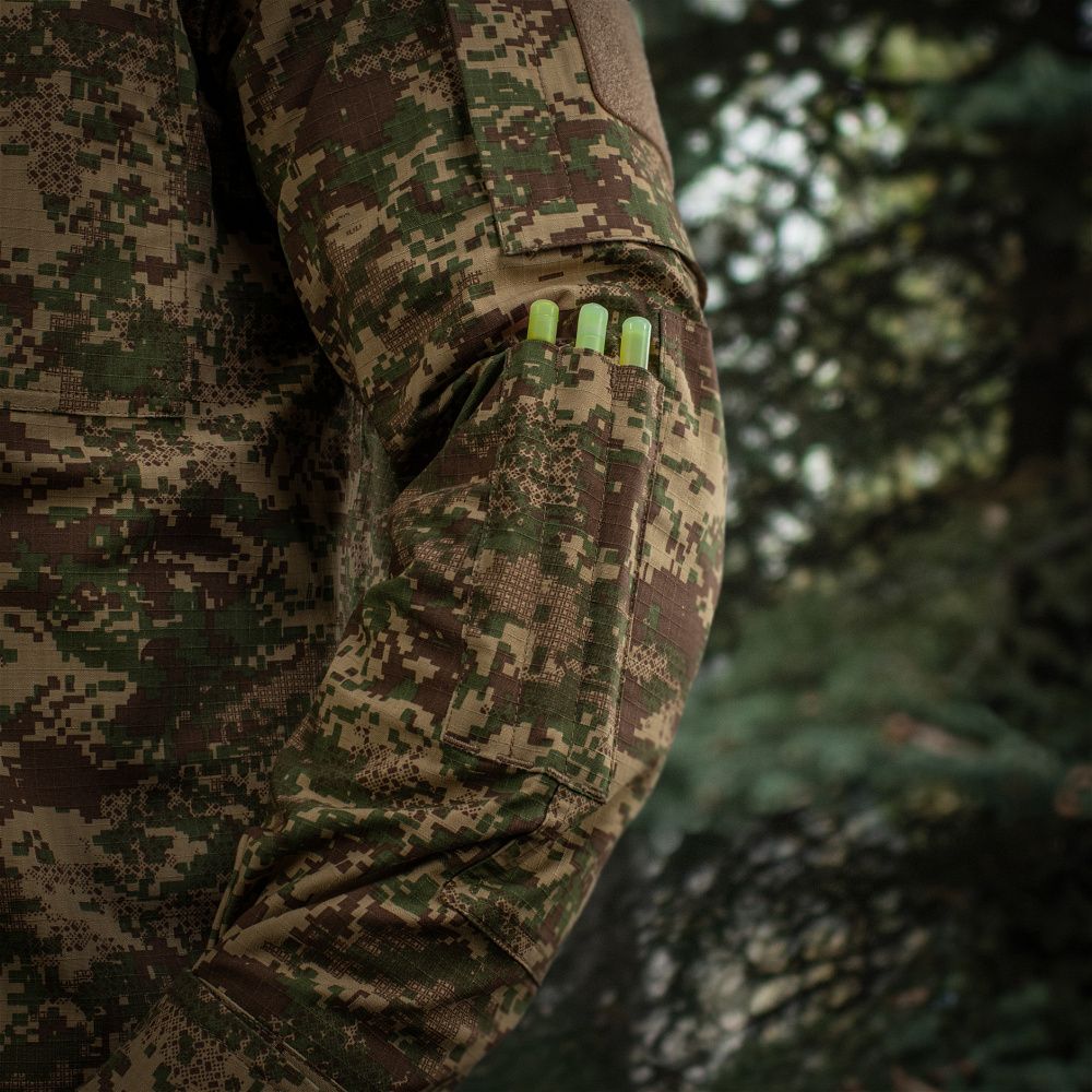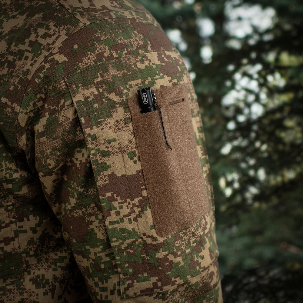 На грудях і рукавах розташовані по дві приховані кишені на блискавках з вертикальними входами для зручного доступу до вмісту. Нагрудні та нарукавні велкро панелі для кріплення іменних ідентифікаторів та патчів. Також на рукавах дизайнери додали відсіки для ручок, олівців та маркерів. Манжети регулюються за об’ємом за допомогою велкро липучки.