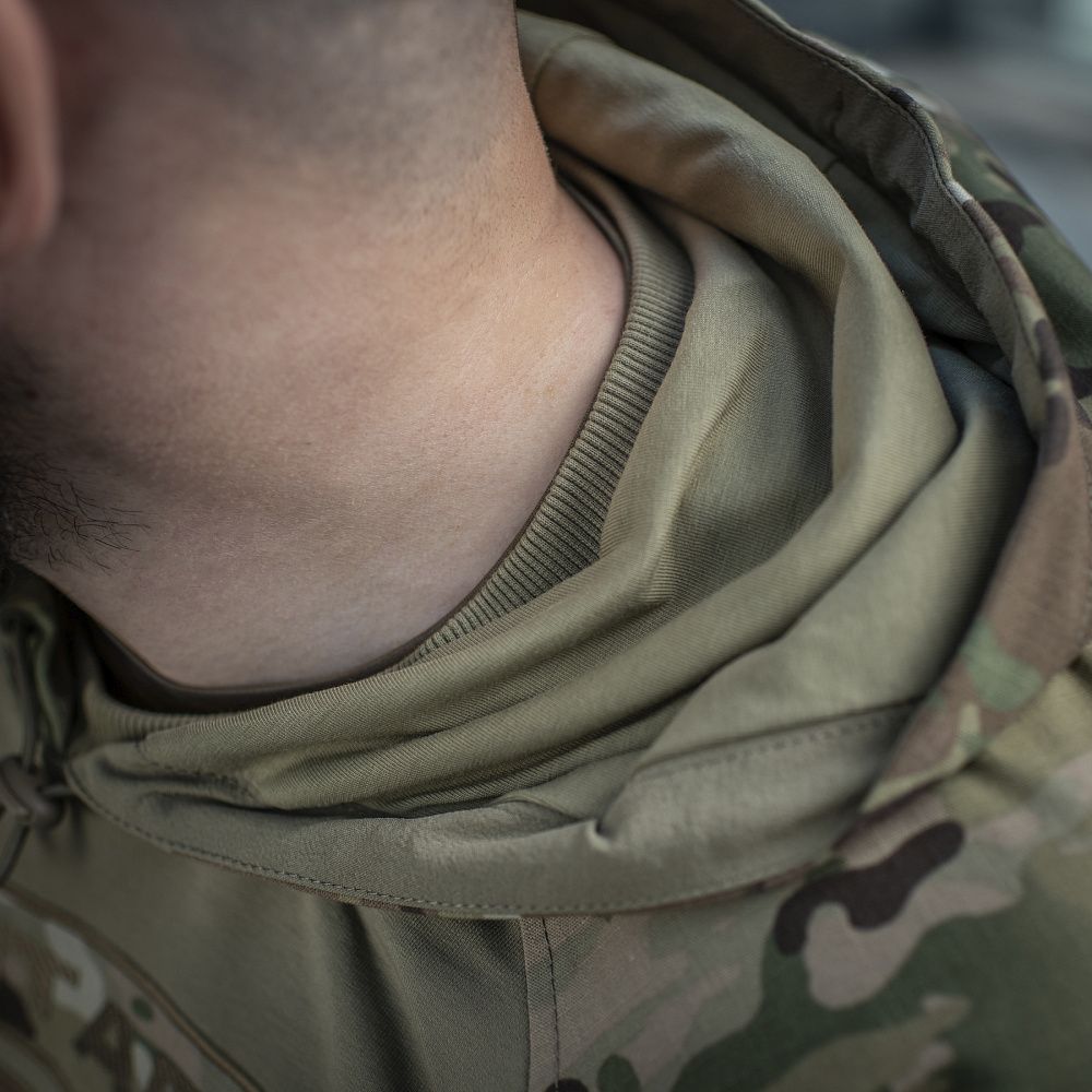 Вільний фасон худі не обмежує рухів під час фізичних навантажень. Рукав-реглан забезпечує ще більшу свободу рухів рук. Кенгуру-кишеня відрізняється своєрідною формою, що нагадує трапецію, і дозволяє зігріти руки, або зберігати необхідні речі. Капюшон і плечові вставки виготовлені з високоякісного матеріалу NYCO Extreme в патерні Multicam. Зручний капюшон регулюється та відмінно захистить від вітру і негоди. На грудях нашита вишивка логотипу бренду. Манжети на рукавах і поясі з трикотажної резинки зберігають форму та запобігають потраплянню холодного повітря. На рукавах кофти розміщені місткі кишені на застібках-блискавках, поверх яких нашиті велкро-панелі для розміщення ідентифікаторів та патчів.