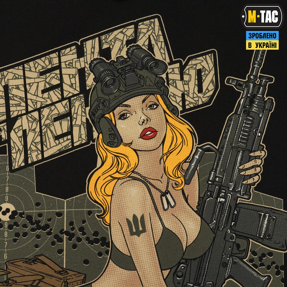 На принті зображена приваблива дівчина в стилі Pin-Up, яка є уособленням краси та сили характеру. Зверху принта розміщений напис: “Лента за лентою” - слова з відомої повстанської пісні, яка стала символом незламного українського визвольного руху. Так само як і в пісні, дівчина тримаючи у своїх руках кулемет М249, готова зайняти місце пораненого воїна, аби завдати нищівного удару противнику. Тож, після її плідної праці, окупантів на українській землі буде менше, а добрива – більше.