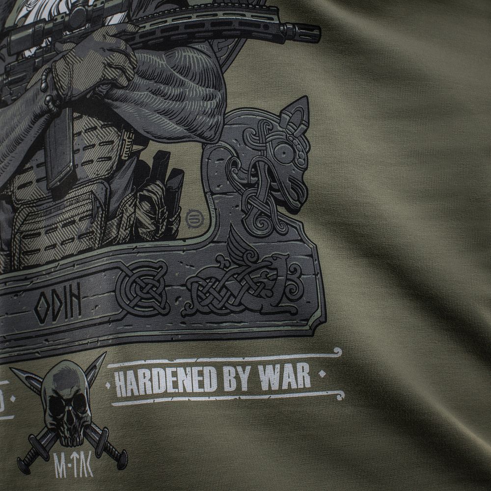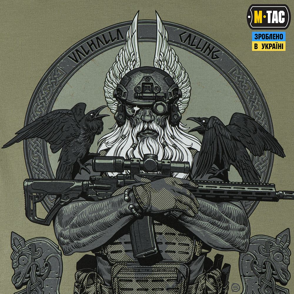 На принті зображений рішуче налаштований Одін, який змінив свій традиційний спис (Гунгнір) на гвинтівку AR-15. У сучасному бойовому спорядженні та в шоломі з ПНБ він готовий вести своїх воїнів в останню битву. На плечі Одіна сидять його вірні супутники – ворони Хугін (думки) і Мунін (пам’ять), які щодня облітають 9 світів і повідомляють верховному богу про все, що відбулося.