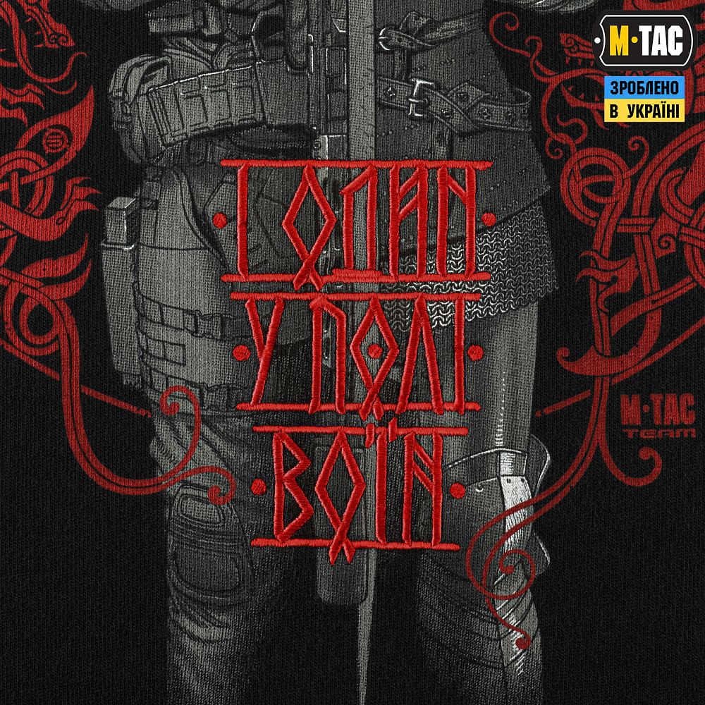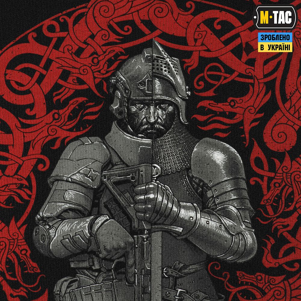 У центрі принта зображений воїн, який тримає оборону попри все. Його образ поділений на дві частини, що символізує тяглість поколінь та стійкість крізь віки – від давнини до сучасності. Символ нагадує: незалежно від епохи, справжній боєць завжди обирає найкращу броню. Колись це були міцні сталеві обладунки, а сьогодні — надійний захист від M-Tac, створений для тих, хто йде назустріч небезпеці з холодною впевненістю й незламною волею.