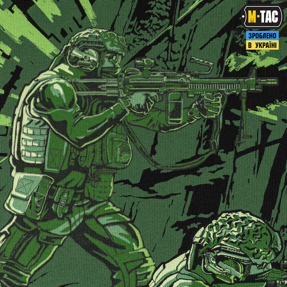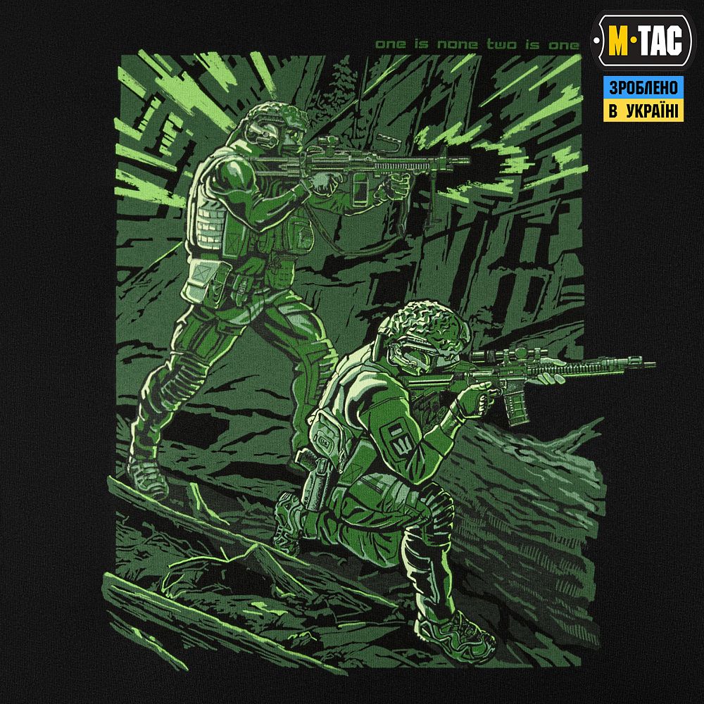 Основою для принта став епізод з життя двох побратимів, зображений через призму приладу нічного бачення. Його доповнюють написи: “one is none two is one” (з англ. – один є ніким, два є одним) та “пліч-о-пліч”, які є символами цінності братерства у найважчих випробуваннях боротьби.