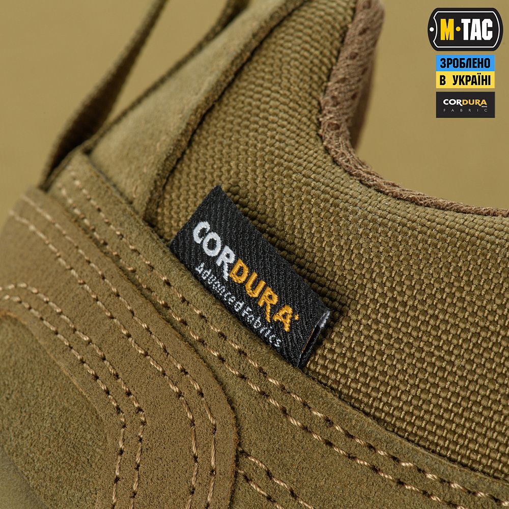 M-Tac кросівки тактичні Patrol R Gen. 2 виготовлені з замші (натуральної італійської гідрофобної шкіри) та оригінального матеріалу Cordura 1000D - якісних й зносостійких матеріалів, які забезпечать захист від механічних пошкоджень та тривалий термін експлуатації. Також, дані матеріали наділяють кросівки вологостійкими, дихаючими та зносостійкими властивостями, які є вкрай необхідними під час тренінгу, руху по бездоріжжю та значних фізичних навантажень.
