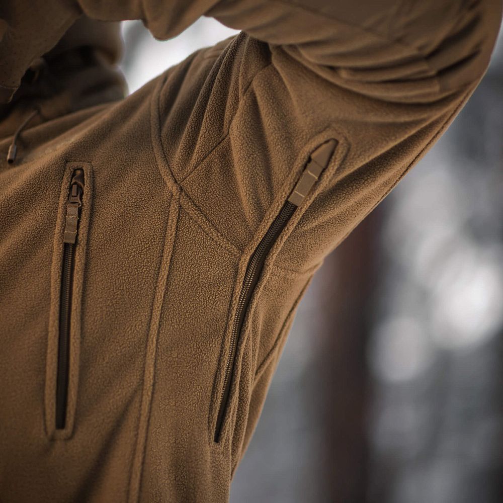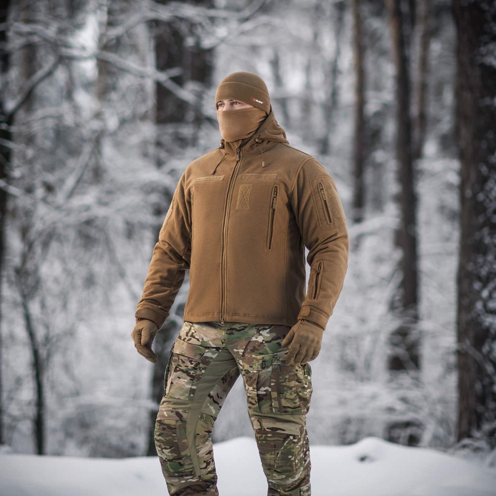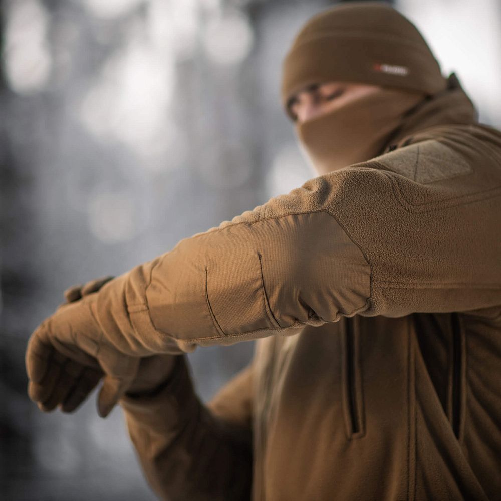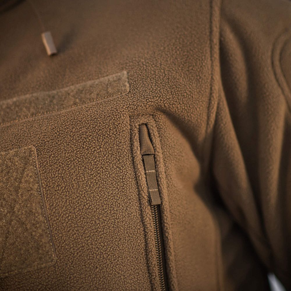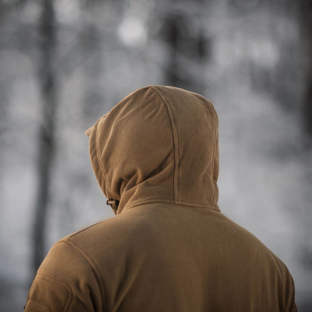 M-Tac куртка флісова Windblock Division Gen.III оснащена незнімним, регульованим капюшоном. У зоні ліктів використані посилені вставки, що підвищують довговічність виробу й захищають його від пошкоджень. Об’єм рукавів регулюється за допомогою велкро-клапану.
