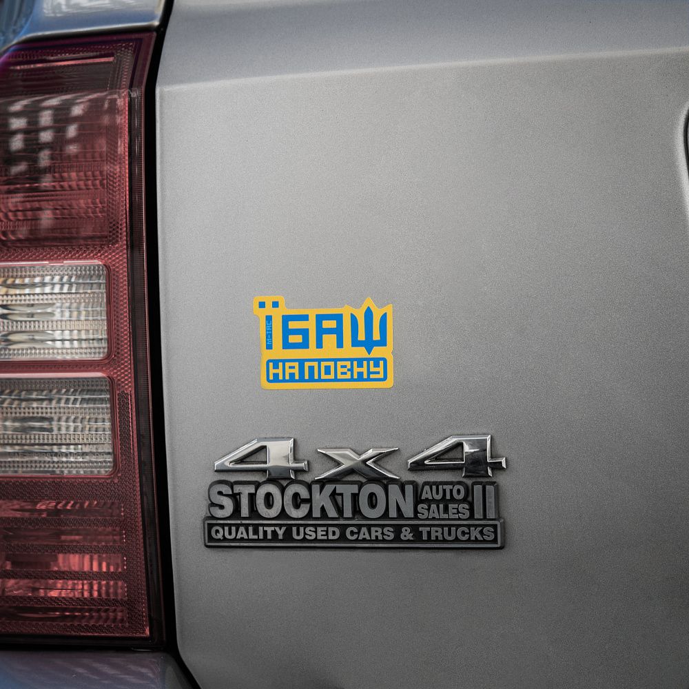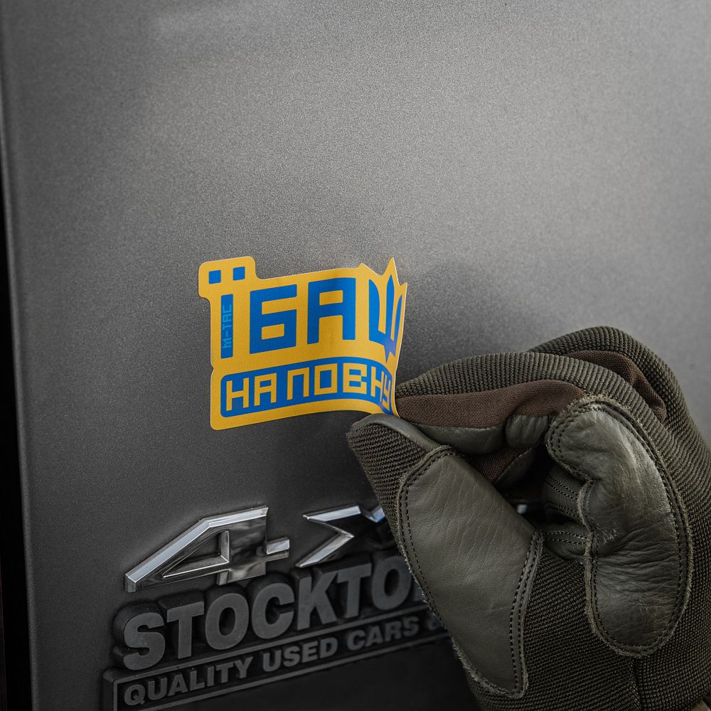 Мотивуюча наклейка від бренду М-Тас створена для загальнонаціонального підняття бойового духу українців. Напис «Їбаш на повну» закликає нещадно знищувати ворогів і виганяти окупантів з України.