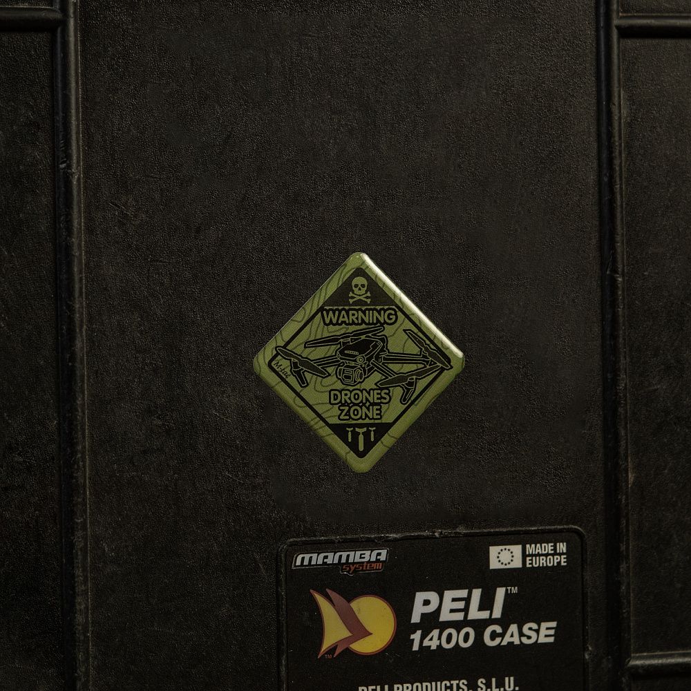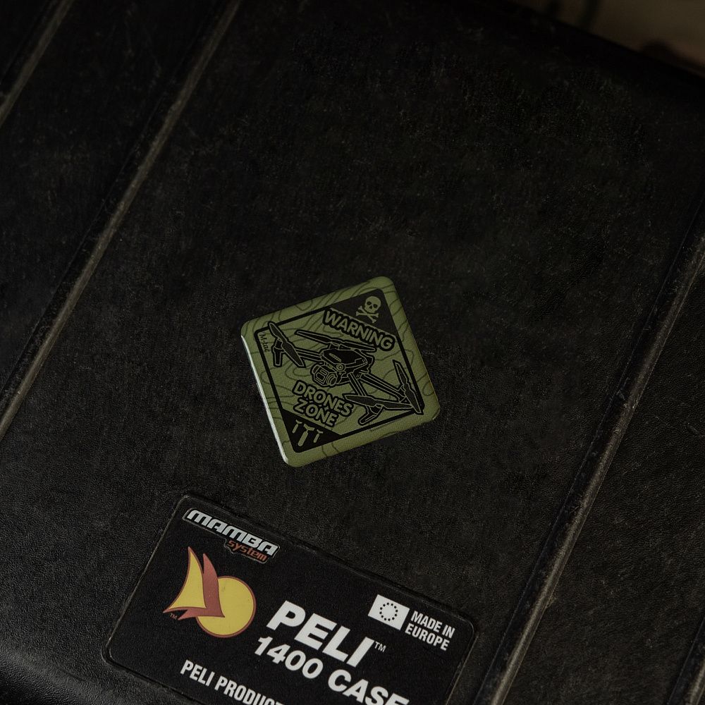 На наклейці зображений дрон з попереджувальною позначкою (небезпека з неба) та напис “Warning Drones Zone”, які натякають, що сьогодні на ворога чекають неприємності від вибухових “опадів”!