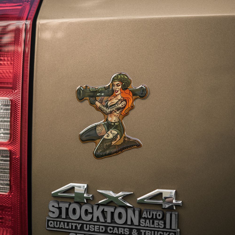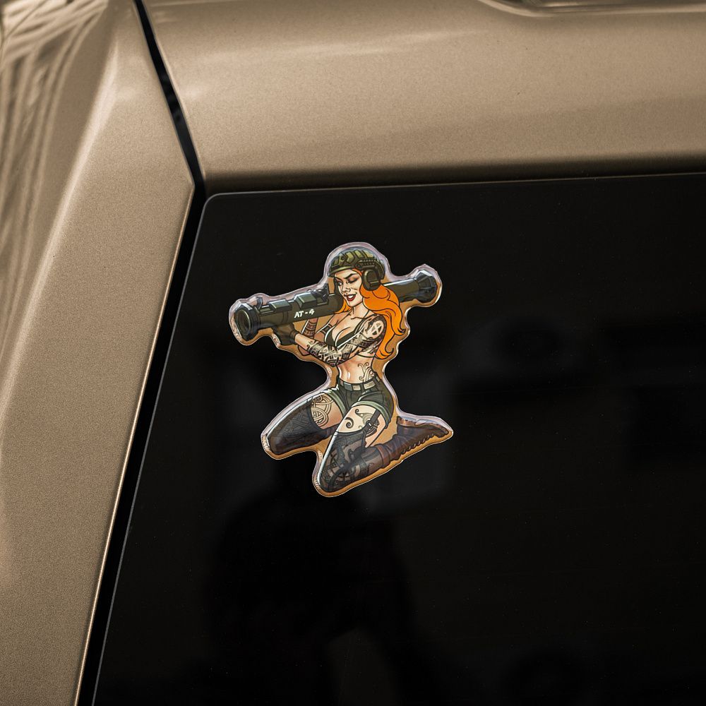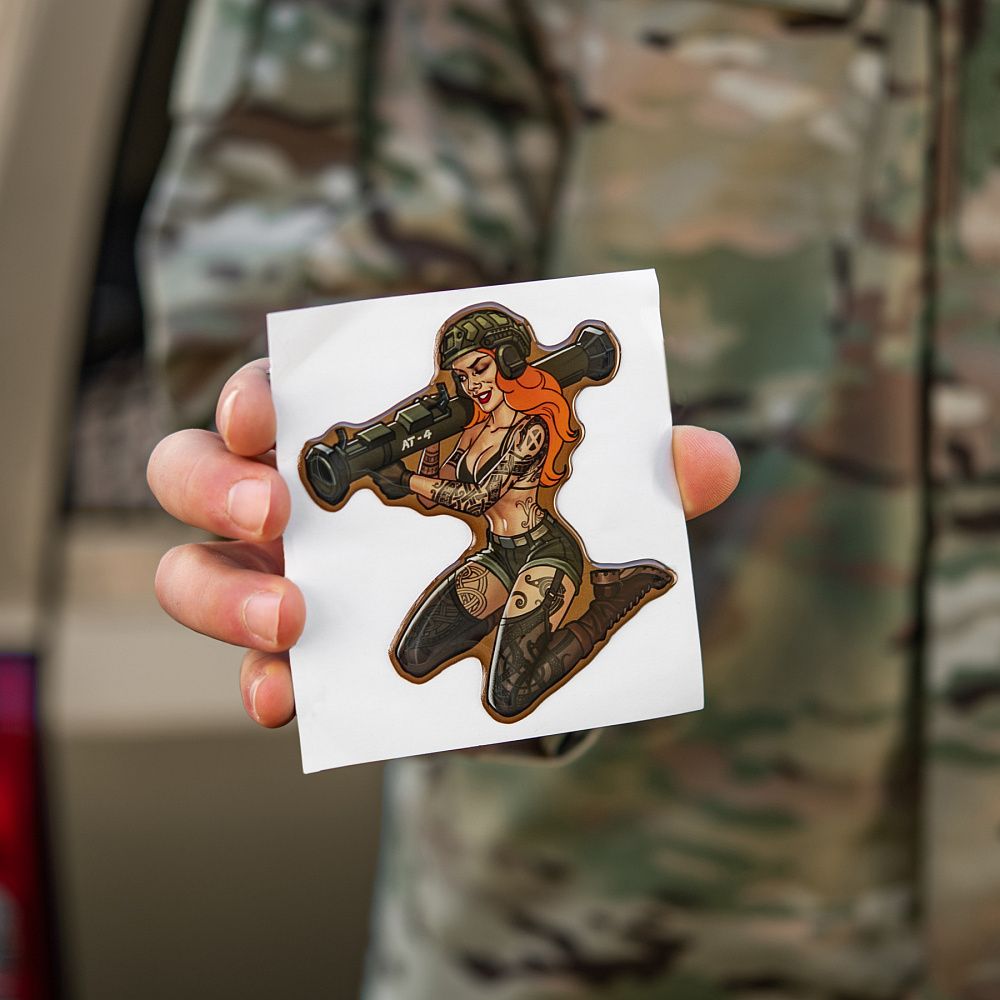 На наклейці зображена харизматична й надзвичайно приваблива дівчина в стилі Pin-Up. Її грація приховує сталеву рішучість, а протитанковий гранатомет АТ-4 на плечі - виражає готовність будь-якої миті вступити в бій. Тіло дівчини покрите тематичними татуюваннями, які повністю передають бойовий дух войовничої красуні. Всі вони наділені особливою силою, виражають глибоке значення та підкреслюють міць її характеру.