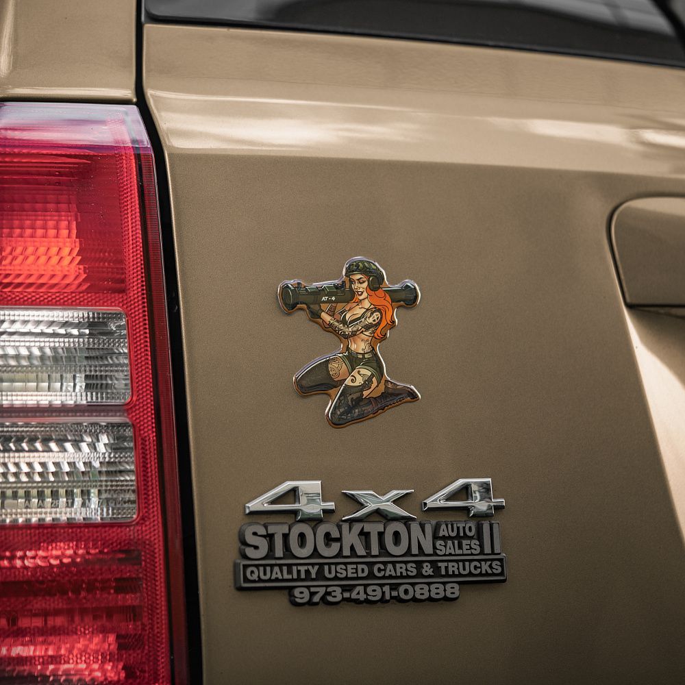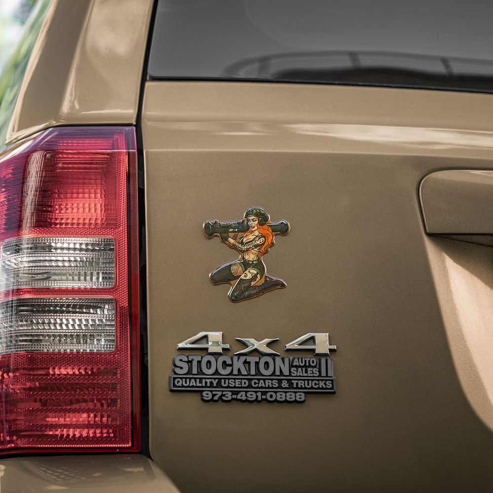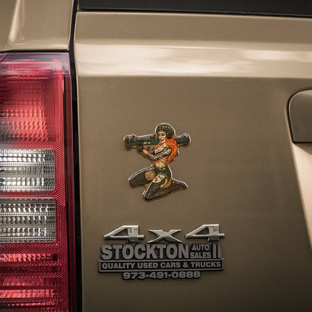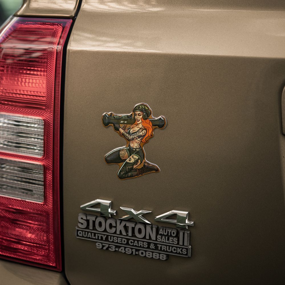 На наклейці зображена харизматична й надзвичайно приваблива дівчина в стилі Pin-Up. Її грація приховує сталеву рішучість, а протитанковий гранатомет АТ-4 на плечі - виражає готовність будь-якої миті вступити в бій. Тіло дівчини покрите тематичними татуюваннями, які повністю передають бойовий дух войовничої красуні. Всі вони наділені особливою силою, виражають глибоке значення та підкреслюють міць її характеру.