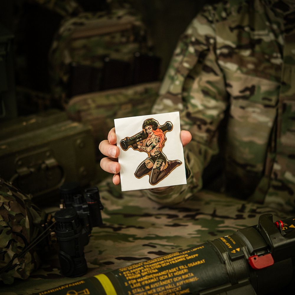 На наклейці зображена харизматична й надзвичайно приваблива дівчина в стилі Pin-Up. Її грація приховує сталеву рішучість, а протитанковий гранатомет АТ-4 на плечі - виражає готовність будь-якої миті вступити в бій. Тіло дівчини покрите тематичними татуюваннями, які повністю передають бойовий дух войовничої красуні.