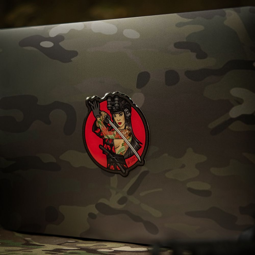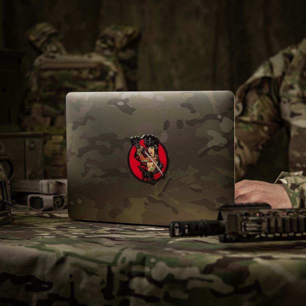 На наклейці зображена войовнича красуня в шоломі, з ПНБ та інтегрованими активними навушниками. Дівчина вправно тримає катану – символ її майстерності та відданості шляху воїна. Вакідзасі (короткий традиційний японський меч) на поясі означає її готовність будь-якої миті вступити в ближній бій зі своїм противником. Її зібраність та рішучість відбиваються в рисах обличчя, адже вона добре знає, що воїн – не лише той, хто володіє зброєю, але й той, хто має сильну волю та непохитний дух.