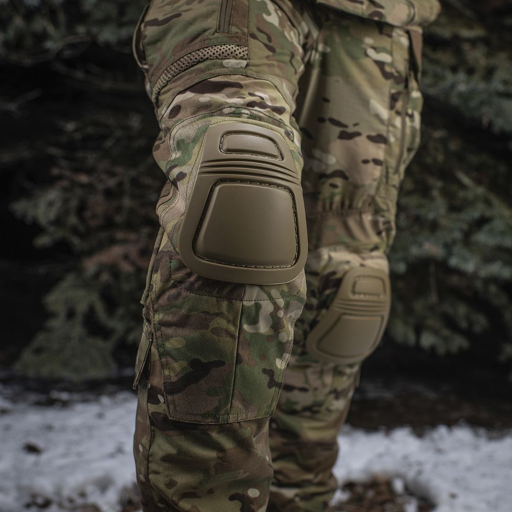 Каркасна чашка пришита до м'якої полімерної основи. Вона виготовлена із гнучкого пластику, що забезпечує свободу рухів при згинанні-розгинанні ноги в коліні. Наколінники фіксуються в отворі штанів моделей M-TAC ШТАНИ ARMY GEN.II NYCO EXTREME за допомогою велкро липучки. При роботі з упором на коліна вони добре захищають від ударів і механічних пошкоджень.