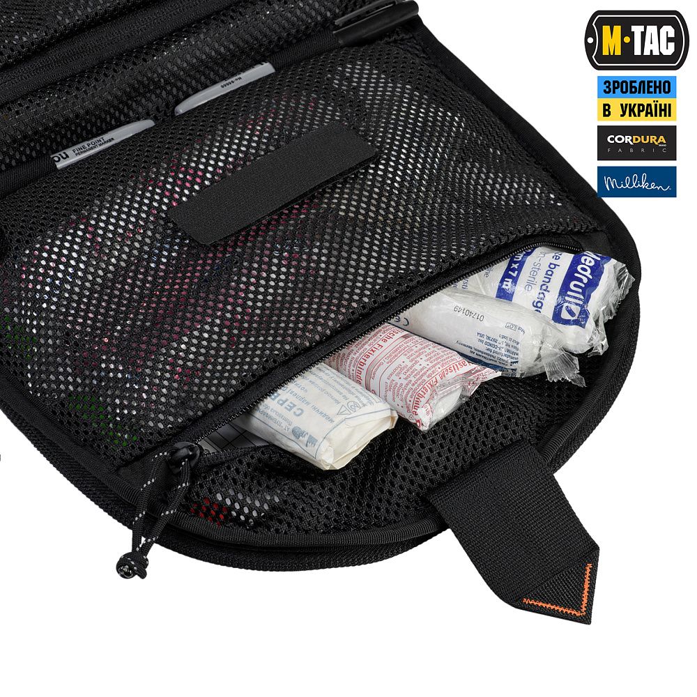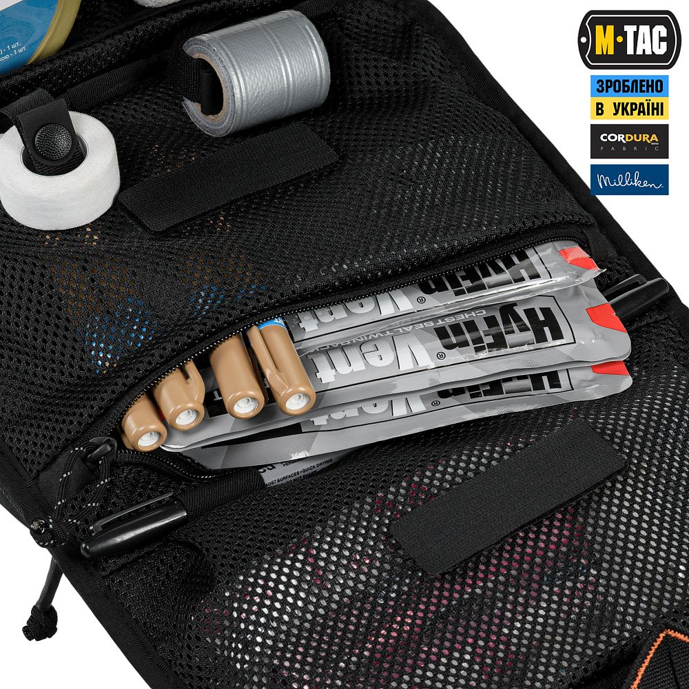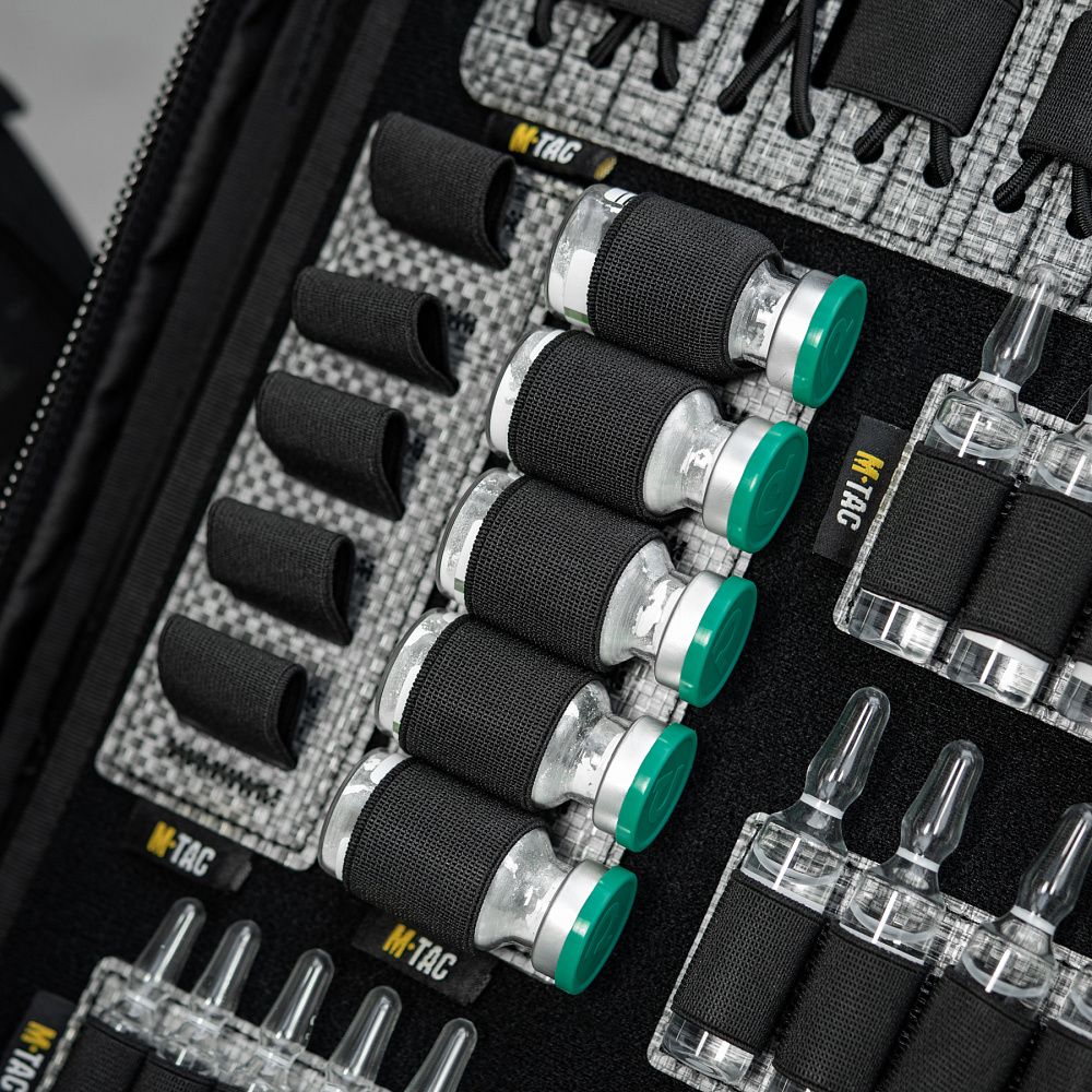 Відсіки для розміщення медичного обладнання виготовлені з інноваційного матеріалу Hypalon та еластичних резинок, на кінцях яких розташовані фіксатори, виробництва корейської компанії Woojin. По центру органайзера — розміщена невелика кишеня (конверт), призначена для розміщення спиртових серветок, катетерного лейкопластиря тощо. Кріпиться до органайзера за допомогою велкро-липучки.