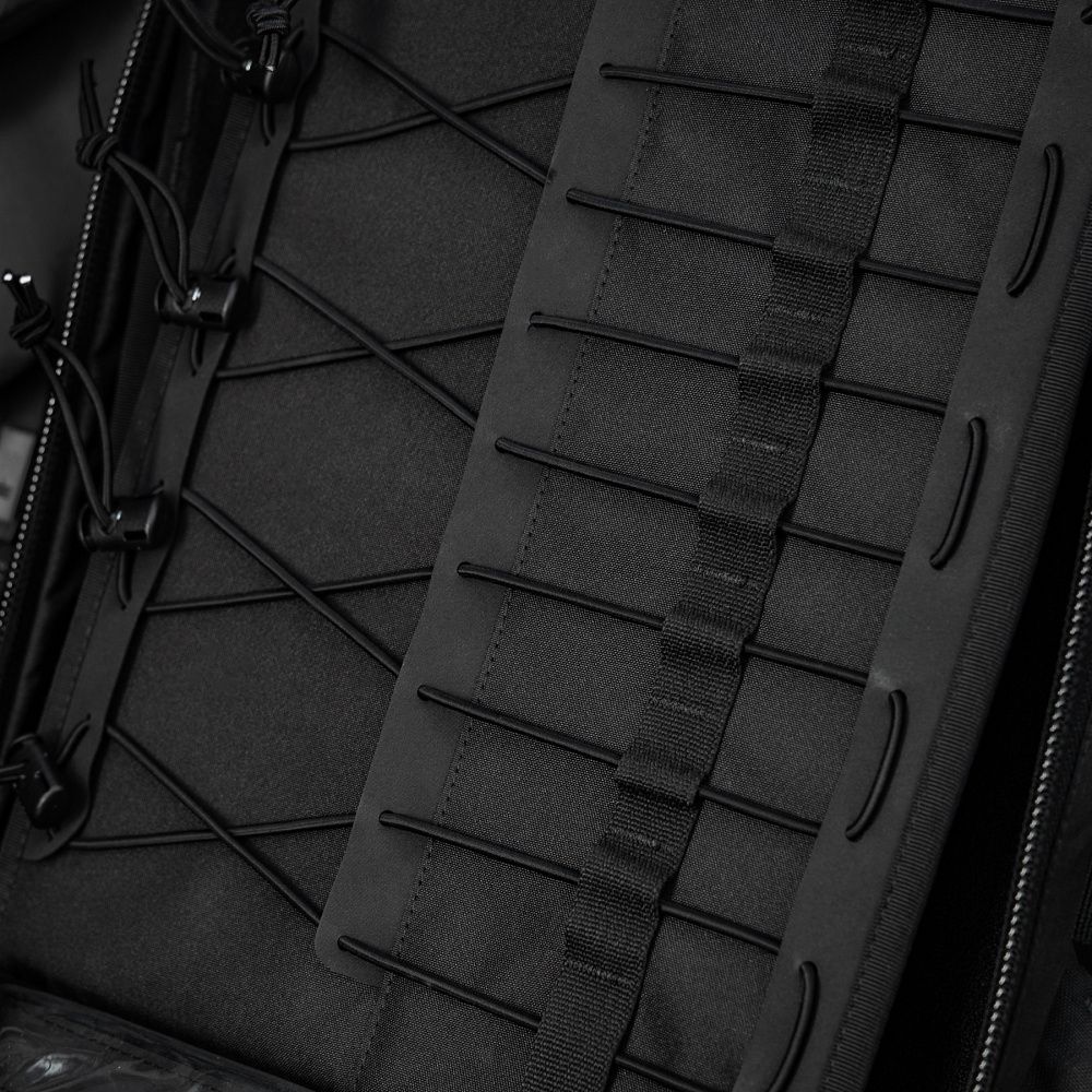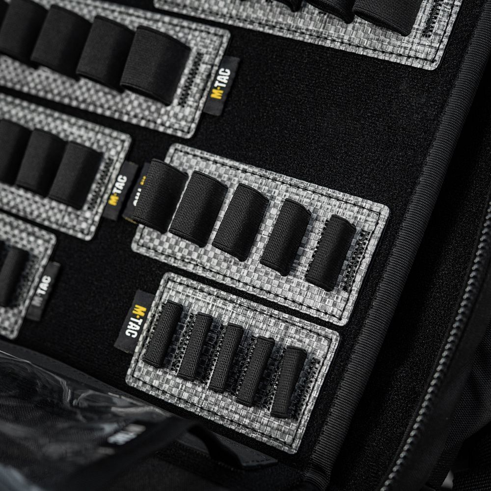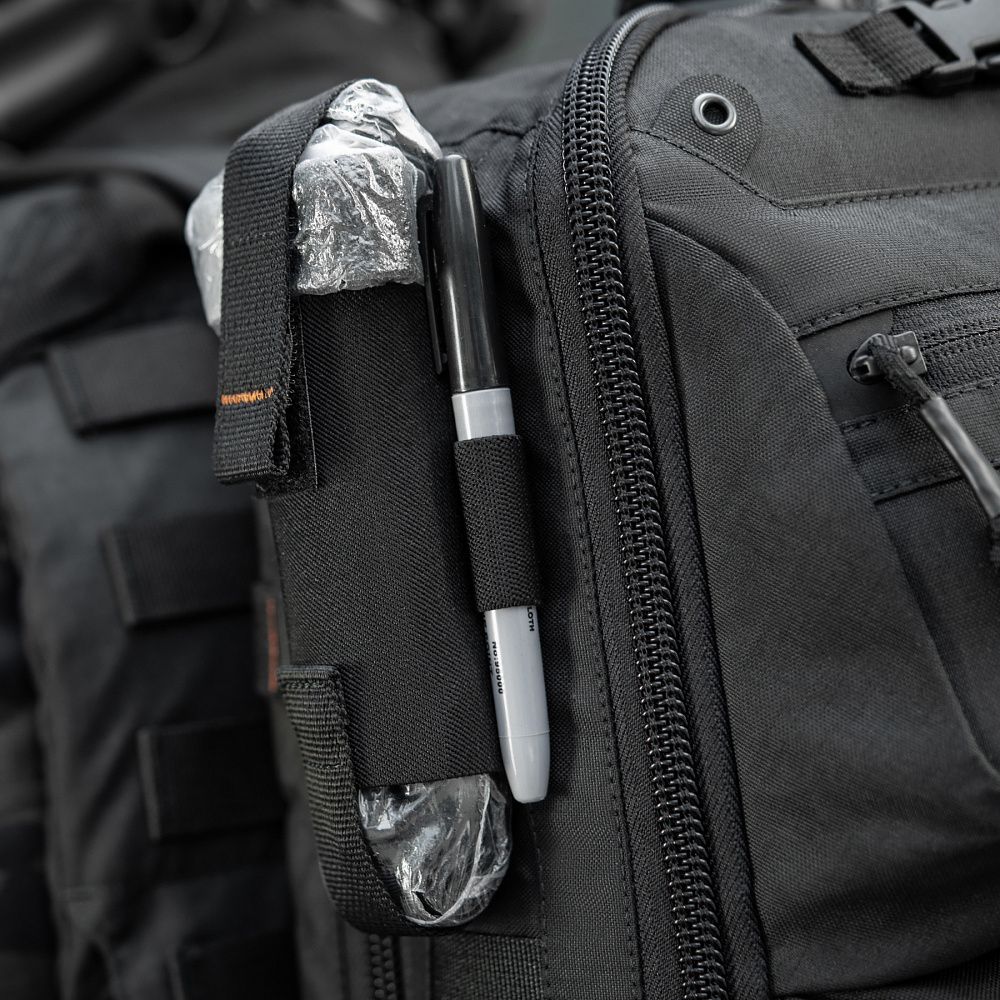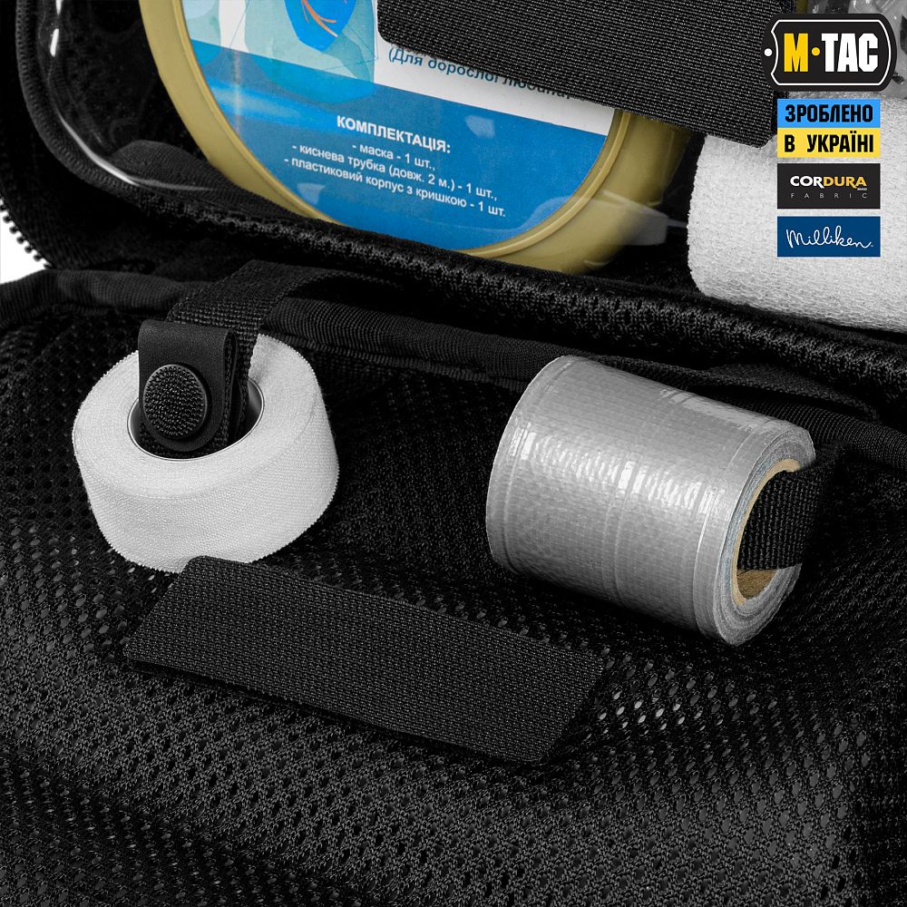 По периметру основної кишені рюкзака розташовані спеціальні тримачі для армованого скотчу, пластиру, джгута тощо. Бічні кріплення виготовлені з еластичної резинки, а нижні — зі строп, що з’єднуються між собою за допомогою кнопок, виробництва японської компанії YKK.
