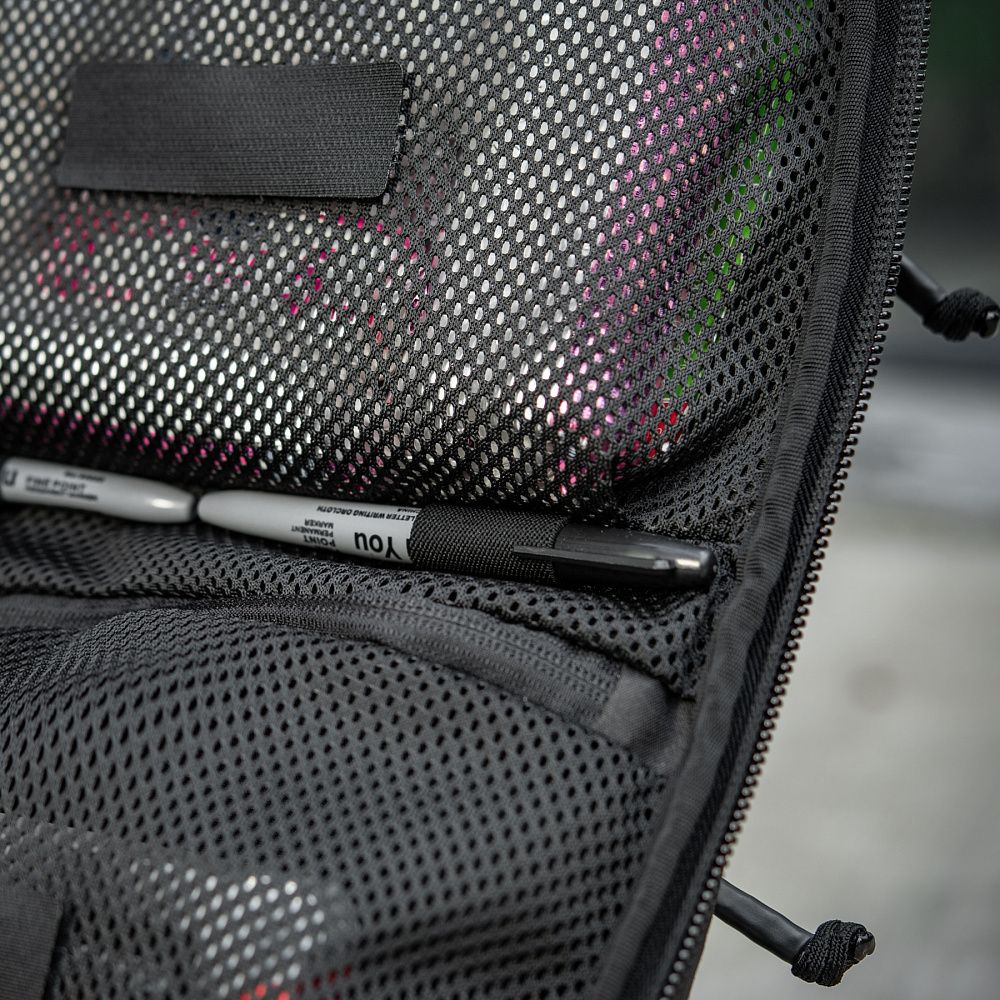 Під верхнім сітчастим відділом розташовані два еластичні тримачі для маркерів. Основа рюкзака виконана з велкро полотна, завдяки чому, прозорі відсіки за потреби можна зняти. Зверху клапана основної кишені розташована спеціальна стропа, призначена для швидкого відкривання кишені (при закриванні її варто помістити між бігунками блискавок, завдяки чому, вона блокуватиме повне закриття рюкзака).