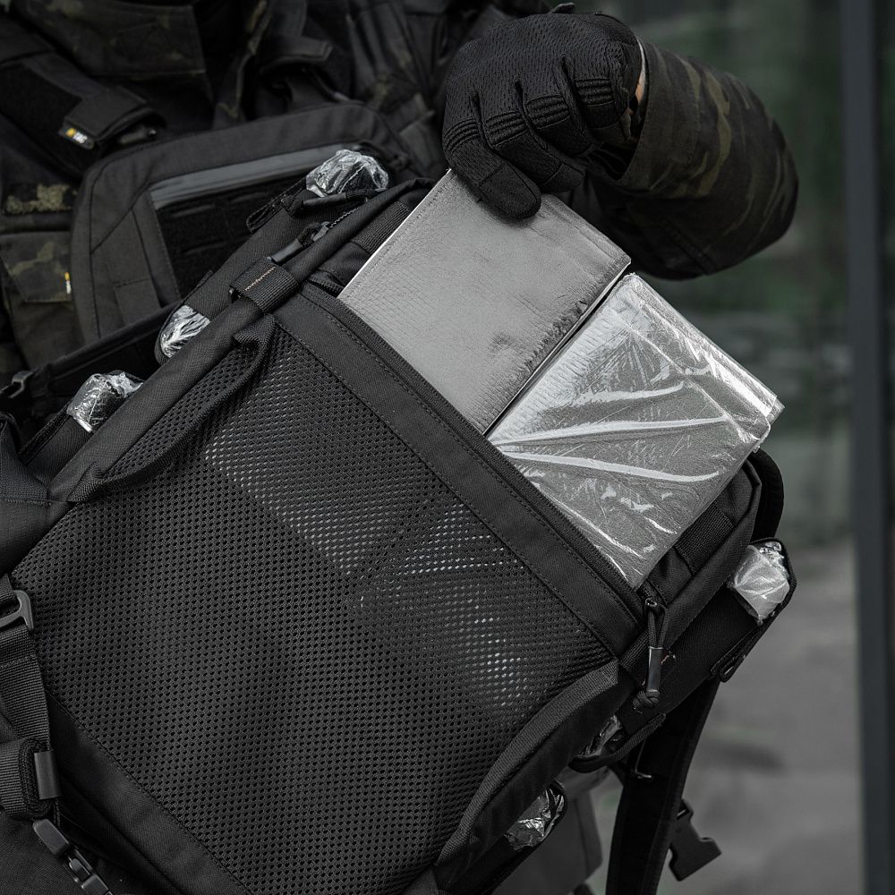 Бічні частини рюкзака оснащені спеціальними стропами з гейткіперами, які при закриванні запобігатимуть повному відкриттю внутрішньої кишені. На спинці рюкзака передбачене додаткове сітчасте відділення на застібці-блискавці, призначене для розміщення іммобілізаційних шин.