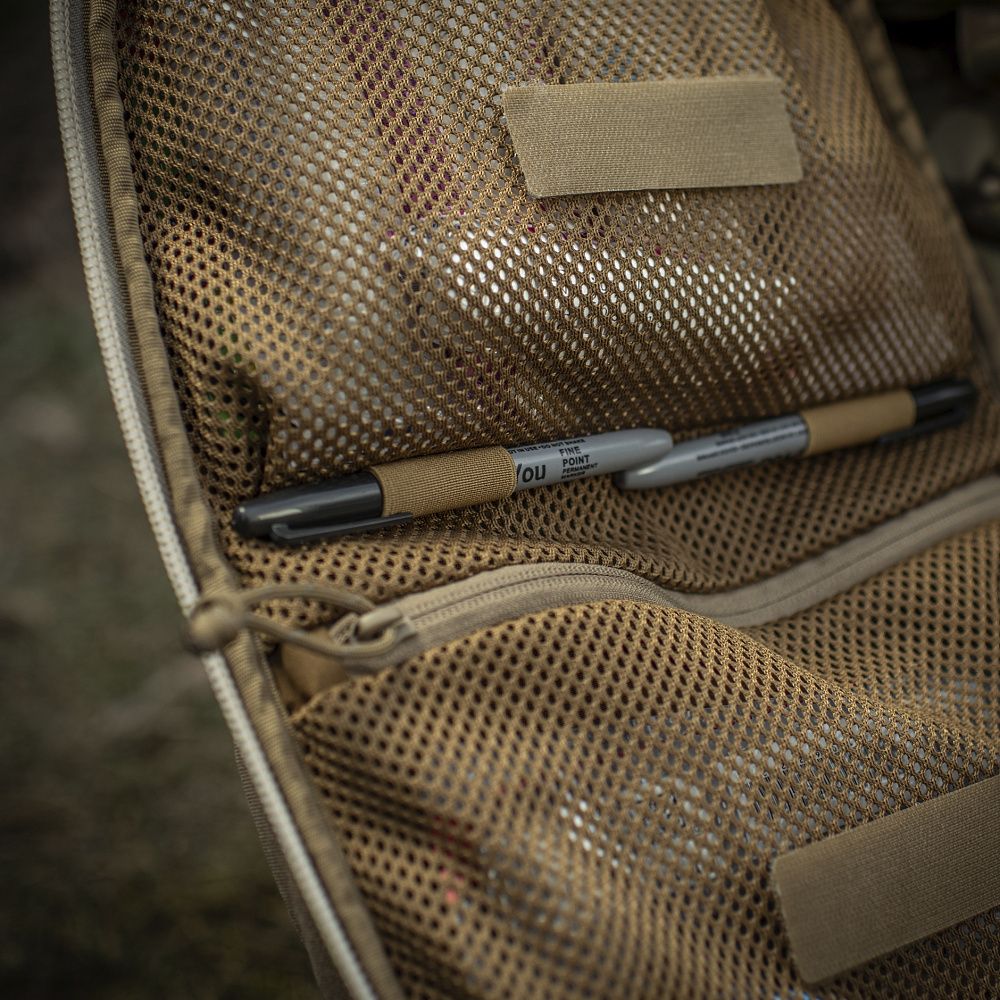 По периметру основної кишені рюкзака розташовані спеціальні тримачі для армованого скотчу, пластиру, джгута тощо. Бічні кріплення виготовлені з еластичної резинки, а нижні — зі строп, що з’єднуються між собою за допомогою кнопок, виробництва японської компанії YKK.