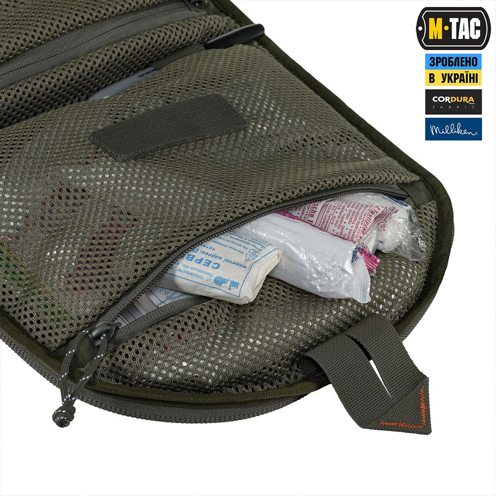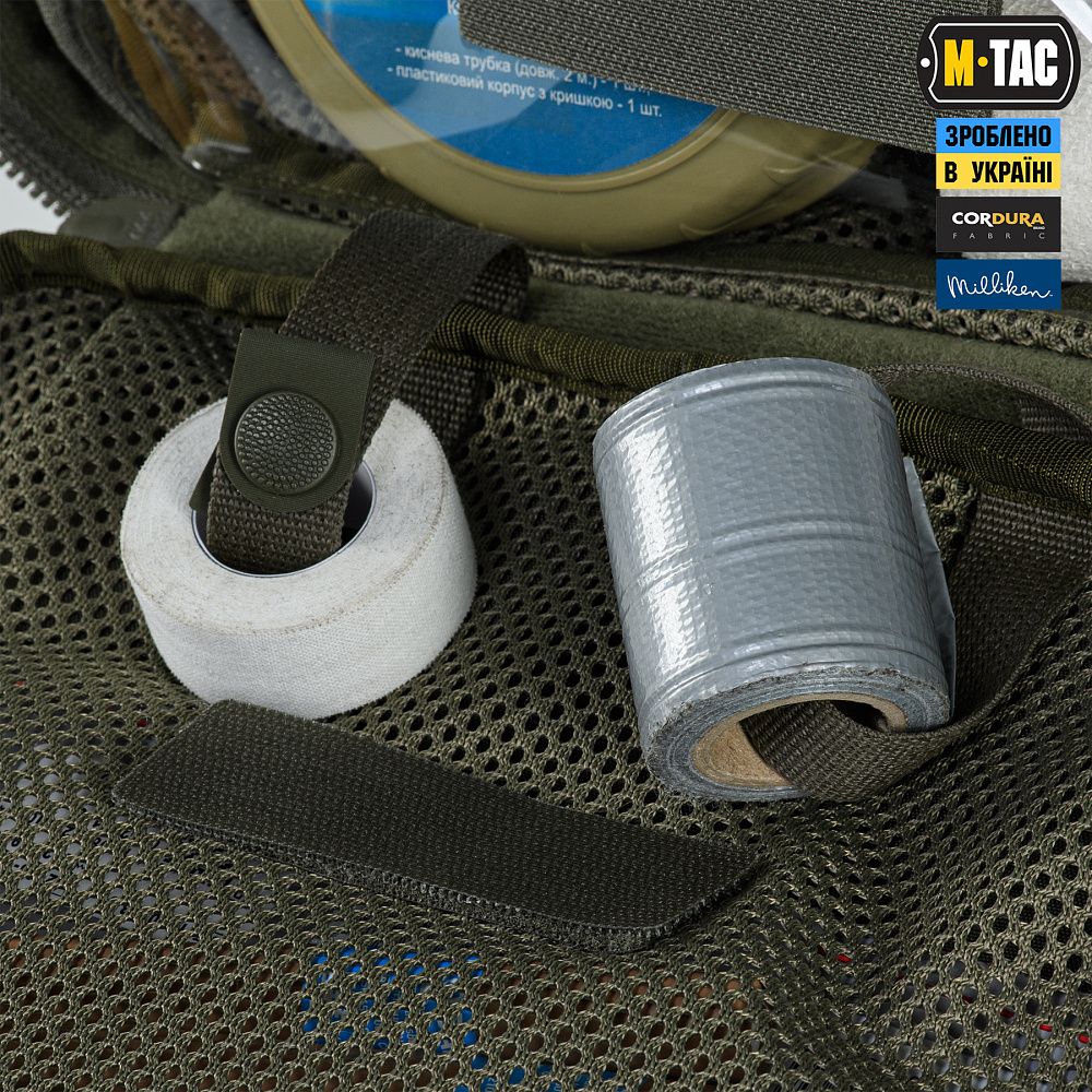 Відсіки для розміщення медичного обладнання виготовлені з інноваційного матеріалу Hypalon та еластичних резинок, на кінцях яких розташовані фіксатори, виробництва корейської компанії Woojin. По центру органайзера — розміщена невелика кишеня (конверт), призначена для розміщення спиртових серветок, катетерного лейкопластиря тощо. Кріпиться до органайзера за допомогою велкро-липучки.