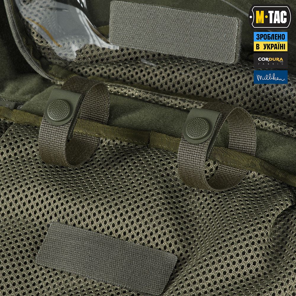 Бічні частини рюкзака оснащені спеціальними стропами з гейткіперами, які при закриванні запобігатимуть повному відкриттю внутрішньої кишені. На спинці рюкзака передбачене додаткове сітчасте відділення на застібці-блискавці, призначене для розміщення іммобілізаційних шин.