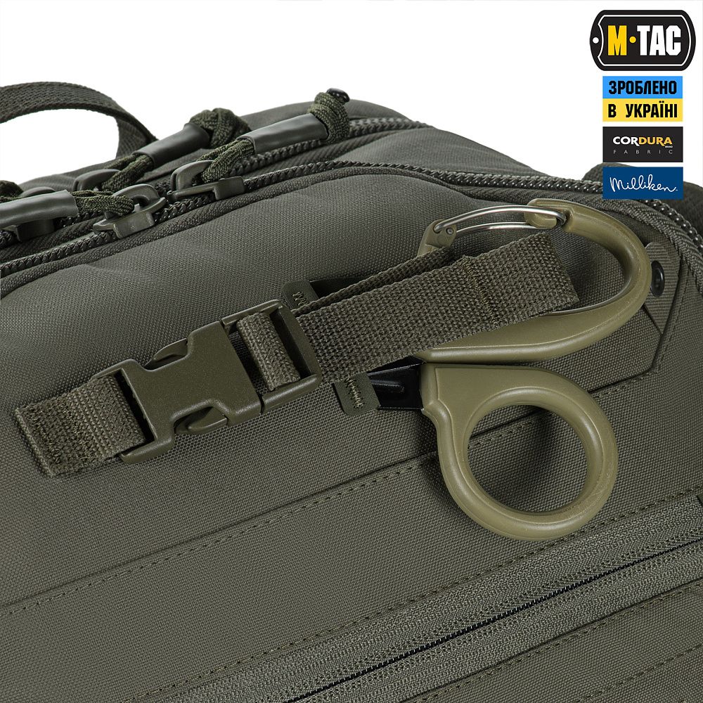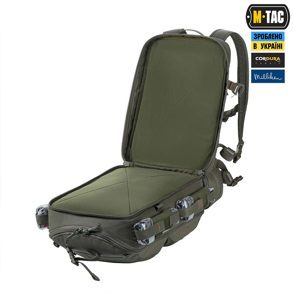 По периметру основної кишені рюкзака розташовані спеціальні тримачі для армованого скотчу, пластиру, джгута тощо. Бічні кріплення виготовлені з еластичної резинки, а нижні — зі строп, що з’єднуються між собою за допомогою кнопок, виробництва японської компанії YKK.