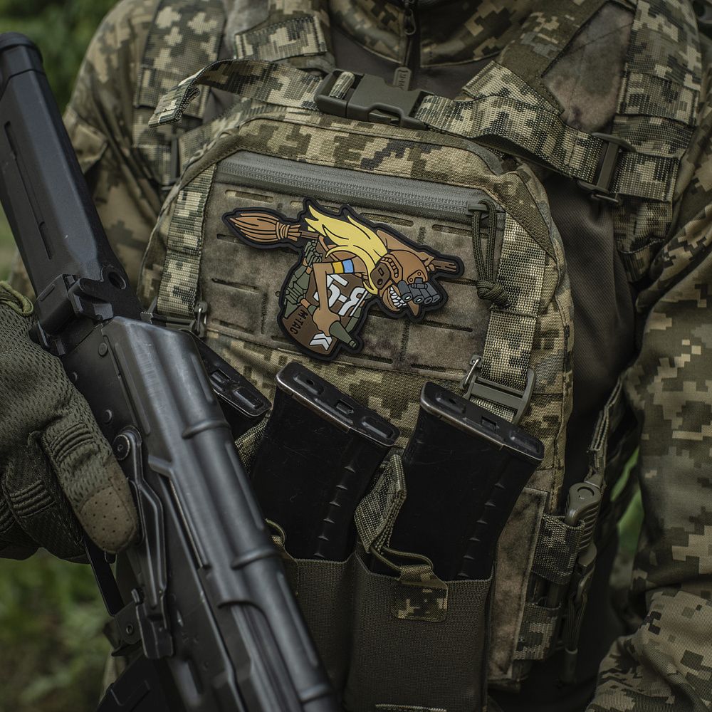 На патчі від М-Тас зображена - молодший сержант Баба Яга в панорамних окулярах нічного бачення GPNVG-18 та з гранатами ПГ-7М, які от-от скине на голову окупантам. Під покровом ночі, вона вправно летить у ступі, оминаючи ворожі засоби РЕБ, та з хижим оскалом звіра вибирає слушний момент, щоб відправити "цінний" подарунок точно в ціль. В окупантів немає жодних шансів, адже порятунку від Баби Яги вони ще не придумали.