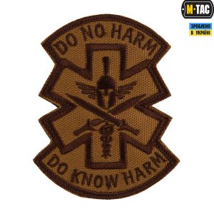 M-Tac нашивка Do No Harm. Гра слів - "Do no harm" - "Не чини шкоди" і "Do know harm" - "Знай як нашкодити" - на англійській мові обидві фрази звучать однаково. Відноситься до військових медиків.