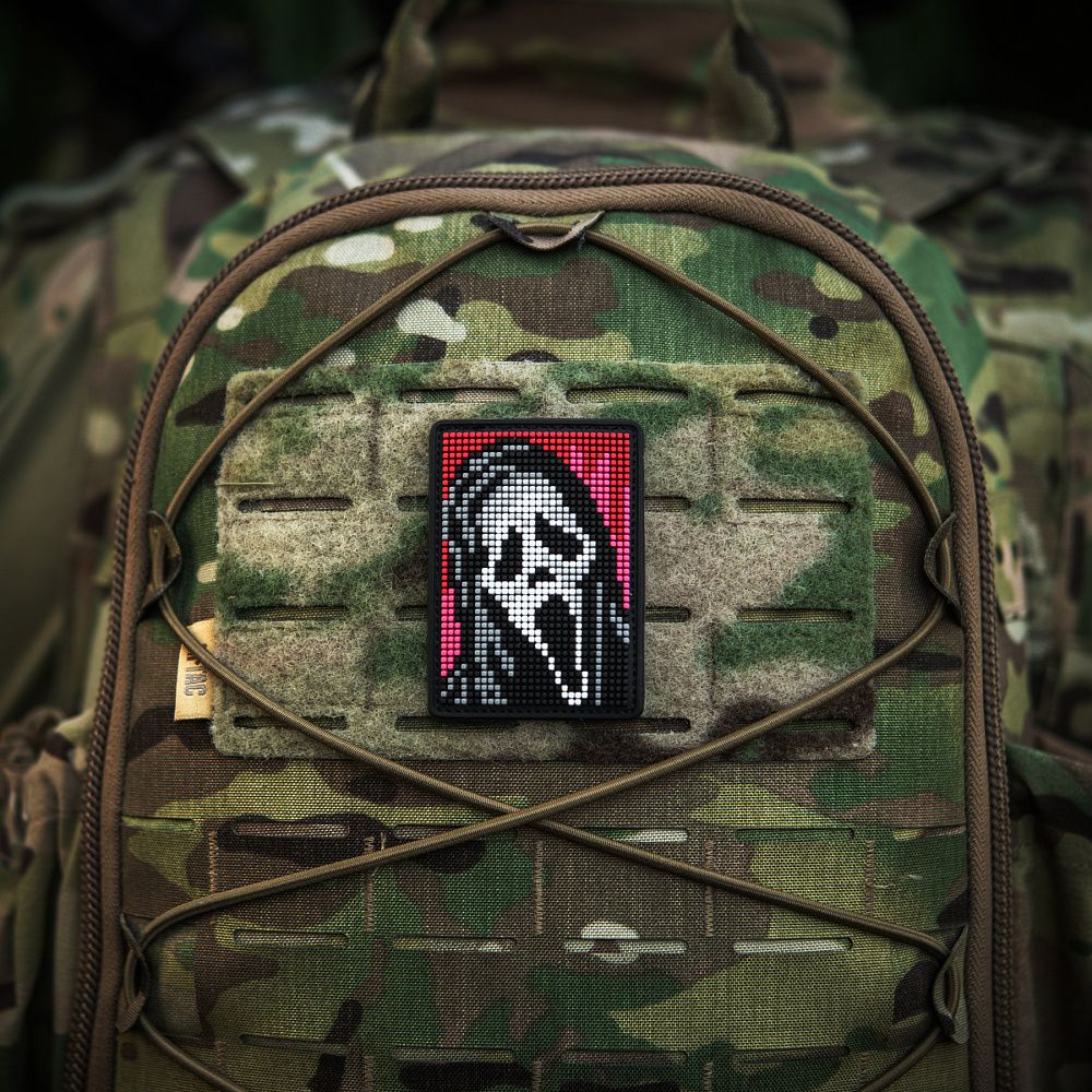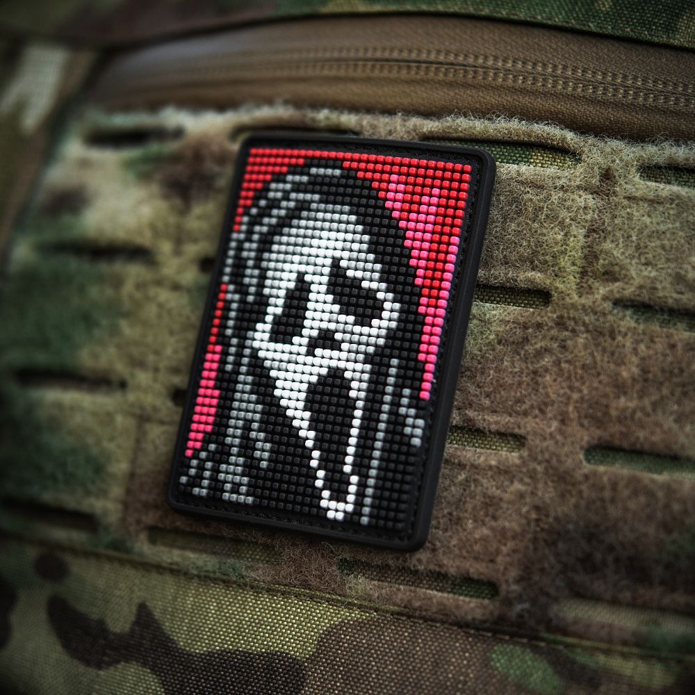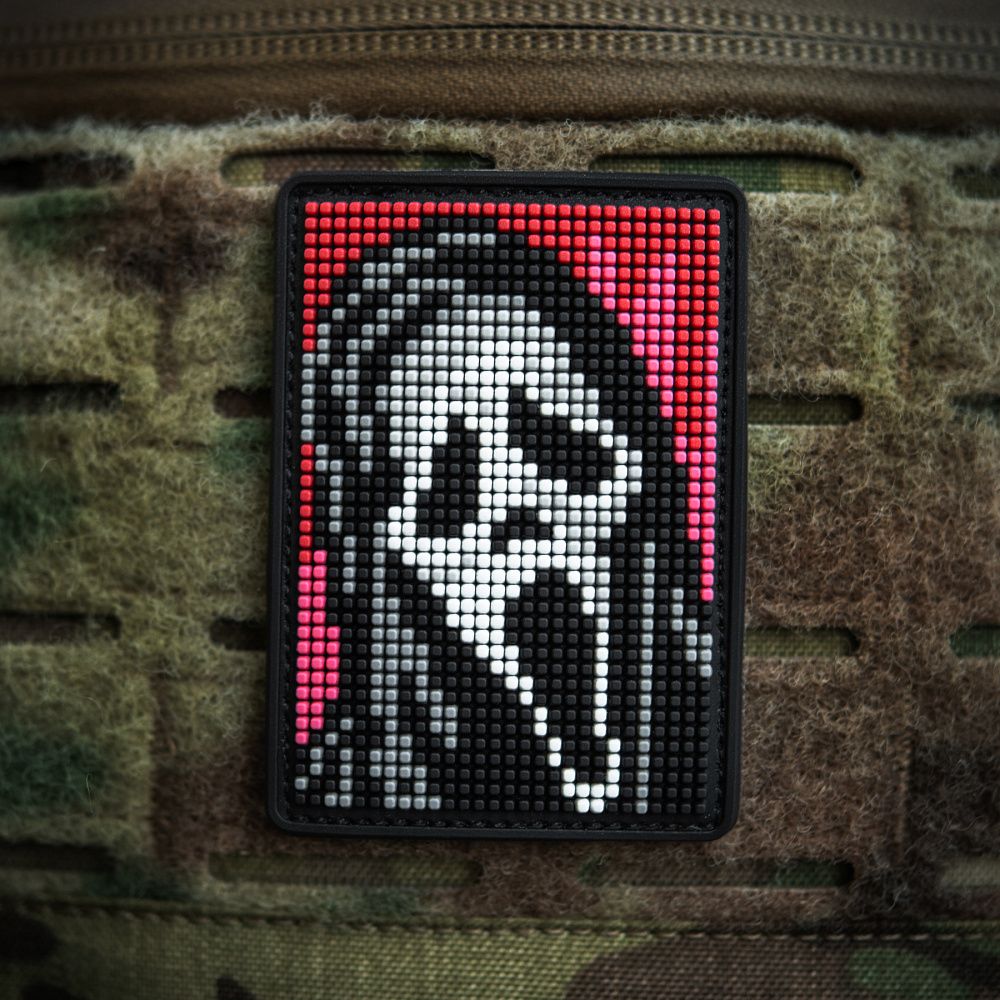 На патчі розміщено центральний елемент серії горор-фільмів – маску Ghostface (з англ. – Примарне обличчя), створену на основі картини “Крик” Едварда Мунка. Зображення виконано у стилі піксельної графіки, яка широко використовувалась у минулому сторіччі для створення відео-ігор, а на сьогодні – є впізнаваним видом цифрового мистецтва.