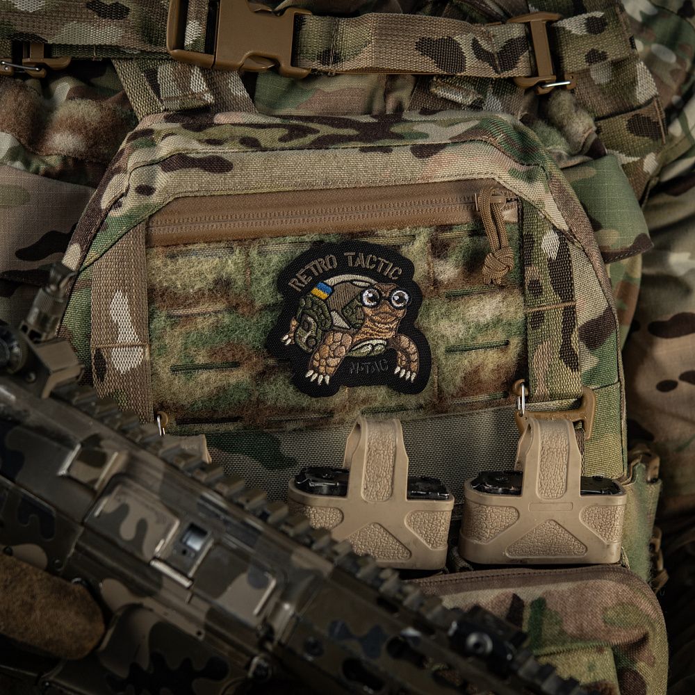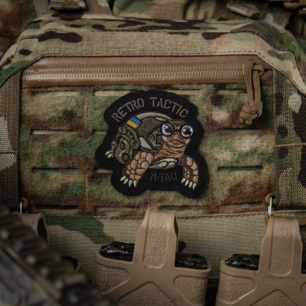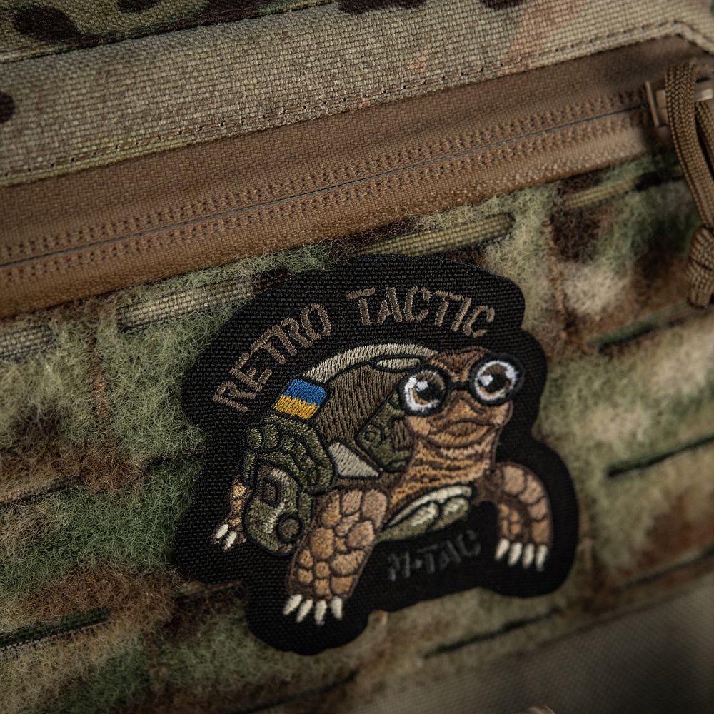На патчі зображена черепаха - символ мудрості та стійкості. Саме ці якості є компенсацією неквапливості, а отже й запорукою вдалого виконання поставлених бойових задач. Сучасні проблеми потребують сучасних рішень, тому черепаха адаптувала свій панцир під новітній шолом типу FAST з активованими навушниками. Напис “RETRO TACTIC” - жартівливо символізує досвідченість та витриманість вже немолодого бійця.