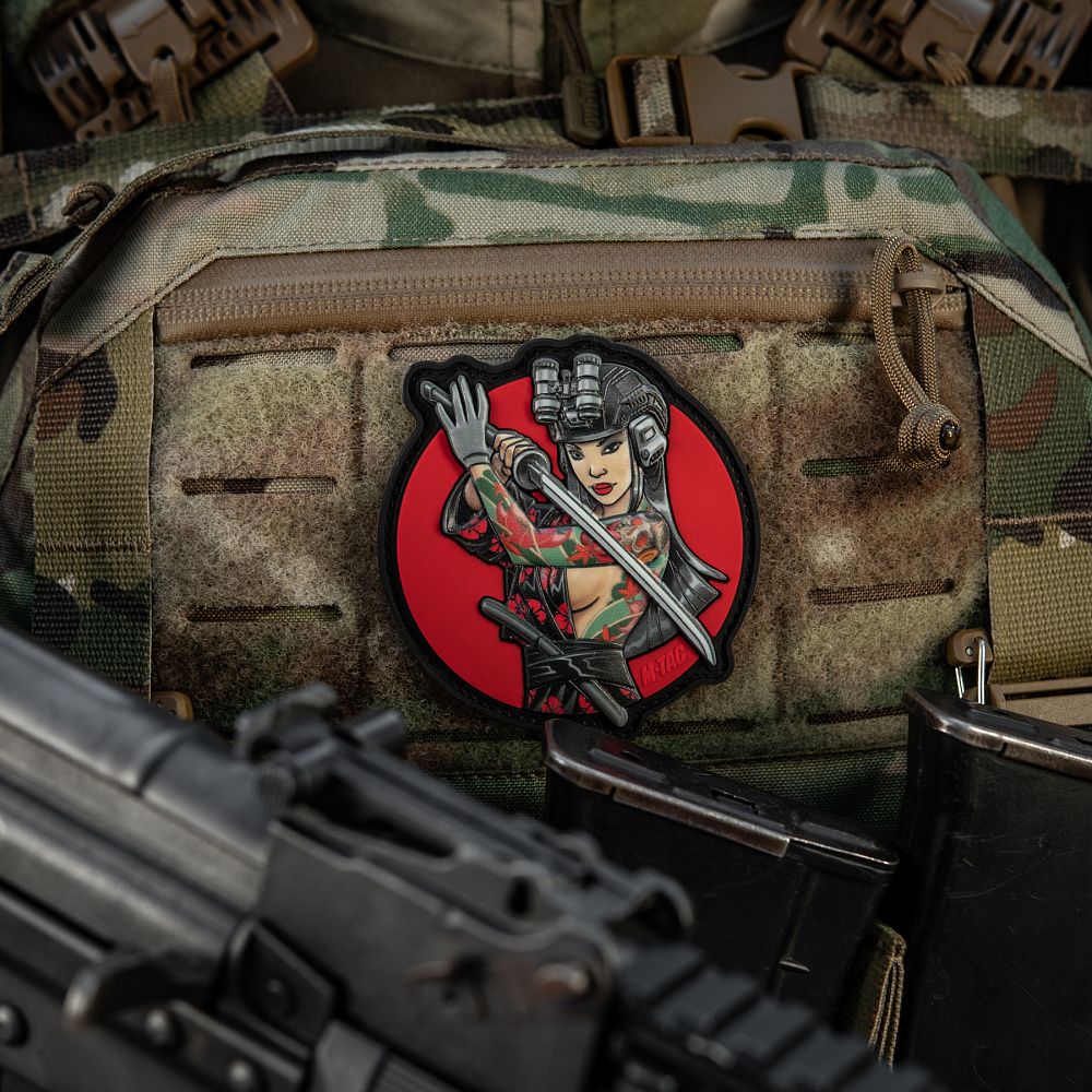 На нашивці зображена войовнича красуня в шоломі, з ПНБ та інтегрованими активними навушниками. Дівчина вправно тримає катану – символ її майстерності та відданості шляху воїна. Вакідзасі (короткий традиційний японський меч) на поясі означає її готовність будь-якої миті вступити в ближній бій зі своїм противником. Її зібраність та рішучість відбиваються в рисах обличчя, адже вона добре знає, що воїн – не лише той, хто володіє зброєю, але й той, хто має сильну волю та непохитний дух.