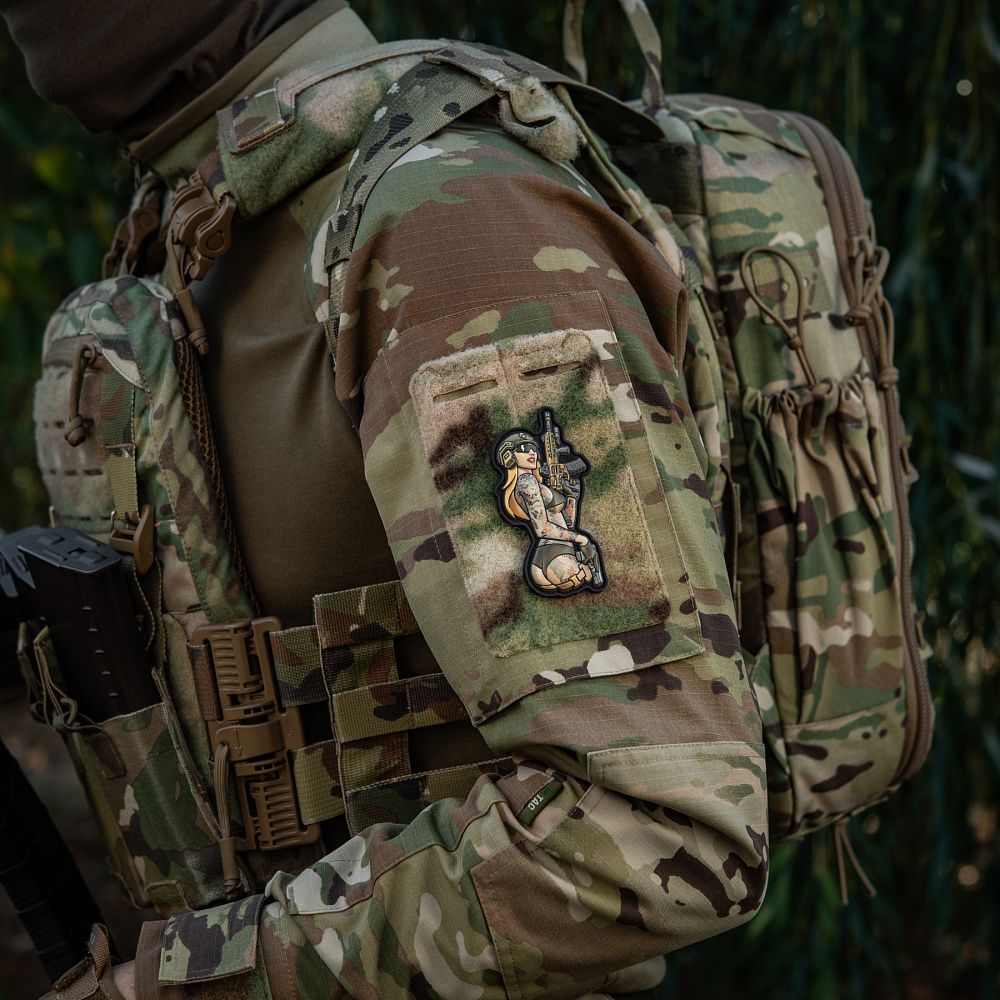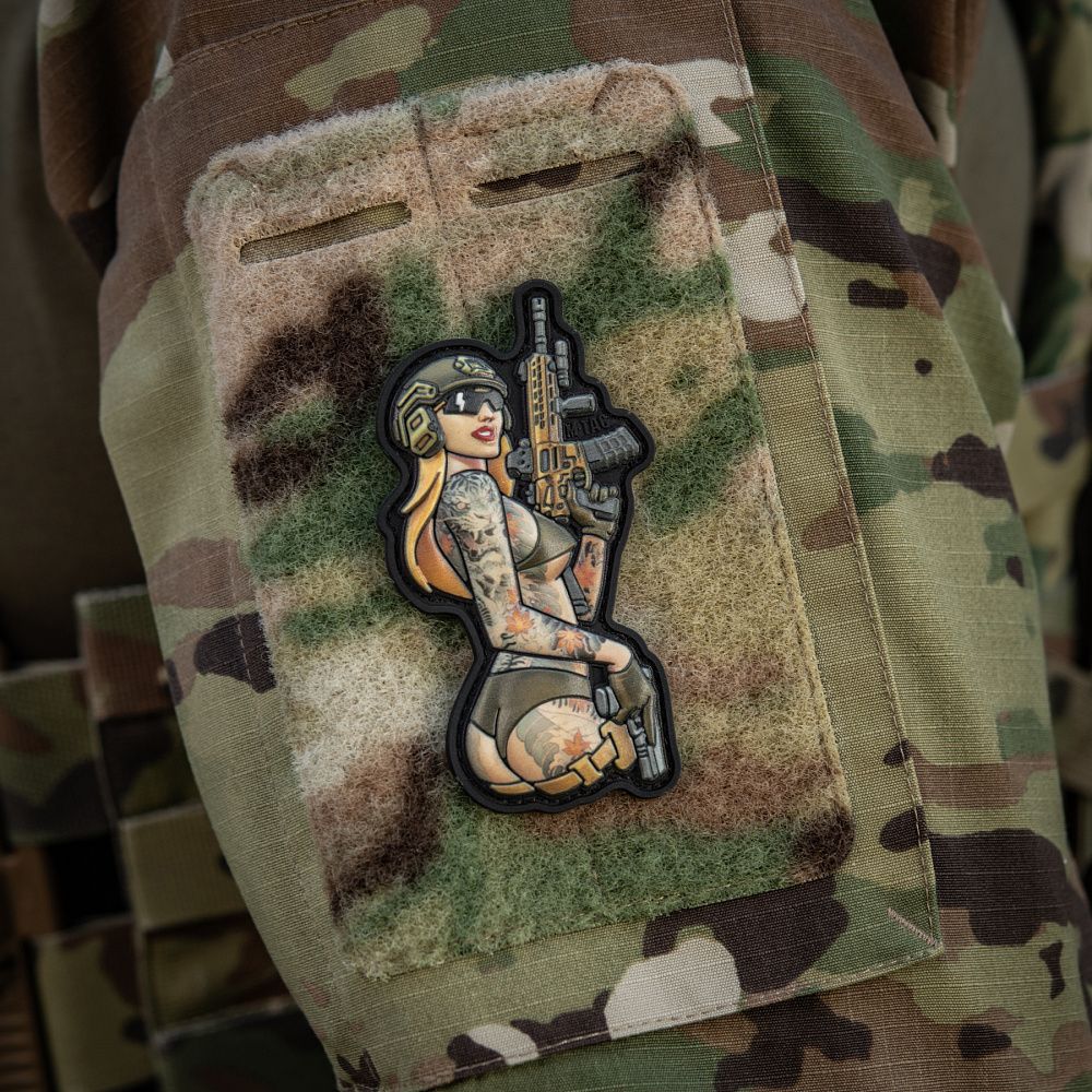Бренд М-Тас, надихнувшись американською Pin-Up культурою часів Другої світової війни, продовжує серію Pin-Up патчів та випустив ще одну версію нашивки Tactical Girl. Харизматична та надзвичайно приваблива, кокетлива та водночас ризикована дівчина в стилі Pin-Up випромінює красу й силу характеру. Вона впевнена та сильна, приваблива й рішуче налаштована на знищення ворогів. В одній руці красуня тримає гвинтівку AR-15, а в іншій – пістолет, тож Double Shot окупантам забезпечений.