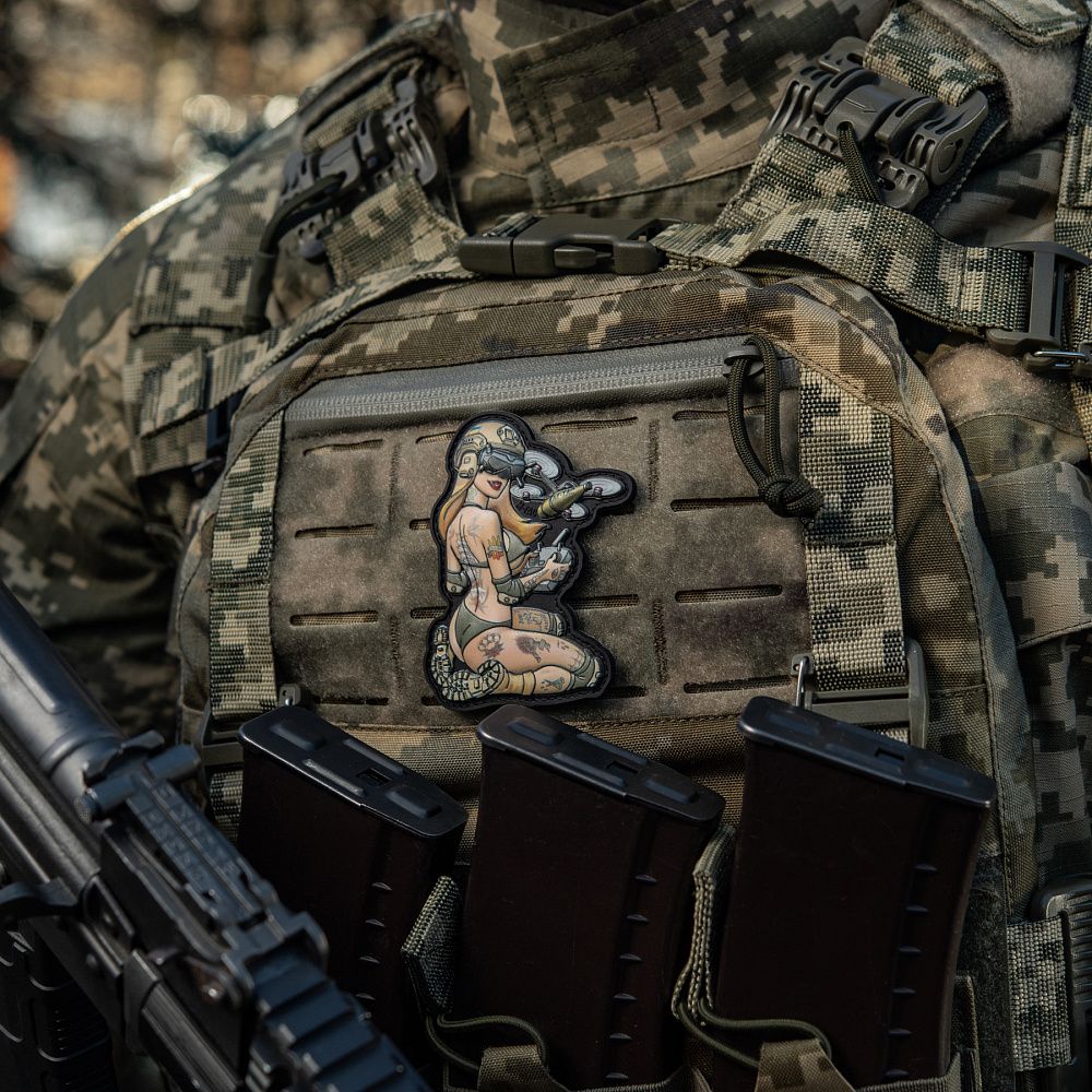 На патчі зображена кокетлива й надзвичайно приваблива дівчина в стилі Pin-Up, що випромінює красу та силу характеру. Вона впевнена та сильна, спокуслива й рішуче налаштована на знищення ворогів. Красуня в спеціальних окулярах майстерно управляє FPV дроном, який несе полум'яний "привіт" окупантам з неба.