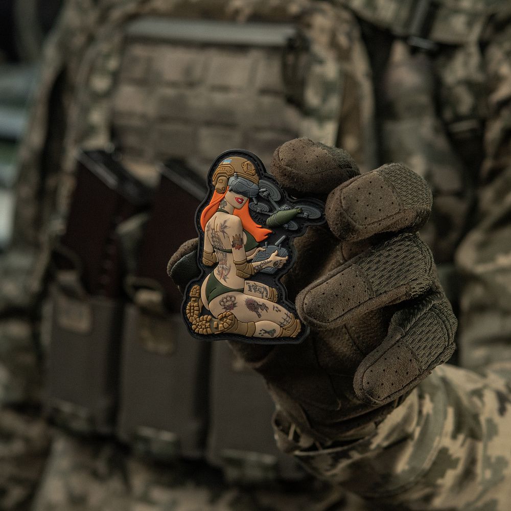 На патчі зображена кокетлива й надзвичайно приваблива дівчина в стилі Pin-Up, що випромінює красу та силу характеру. Вона впевнена та сильна, спокуслива й рішуче налаштована на знищення ворогів. Красуня в спеціальних окулярах майстерно управляє FPV дроном, який несе полум'яний "привіт" окупантам з неба.