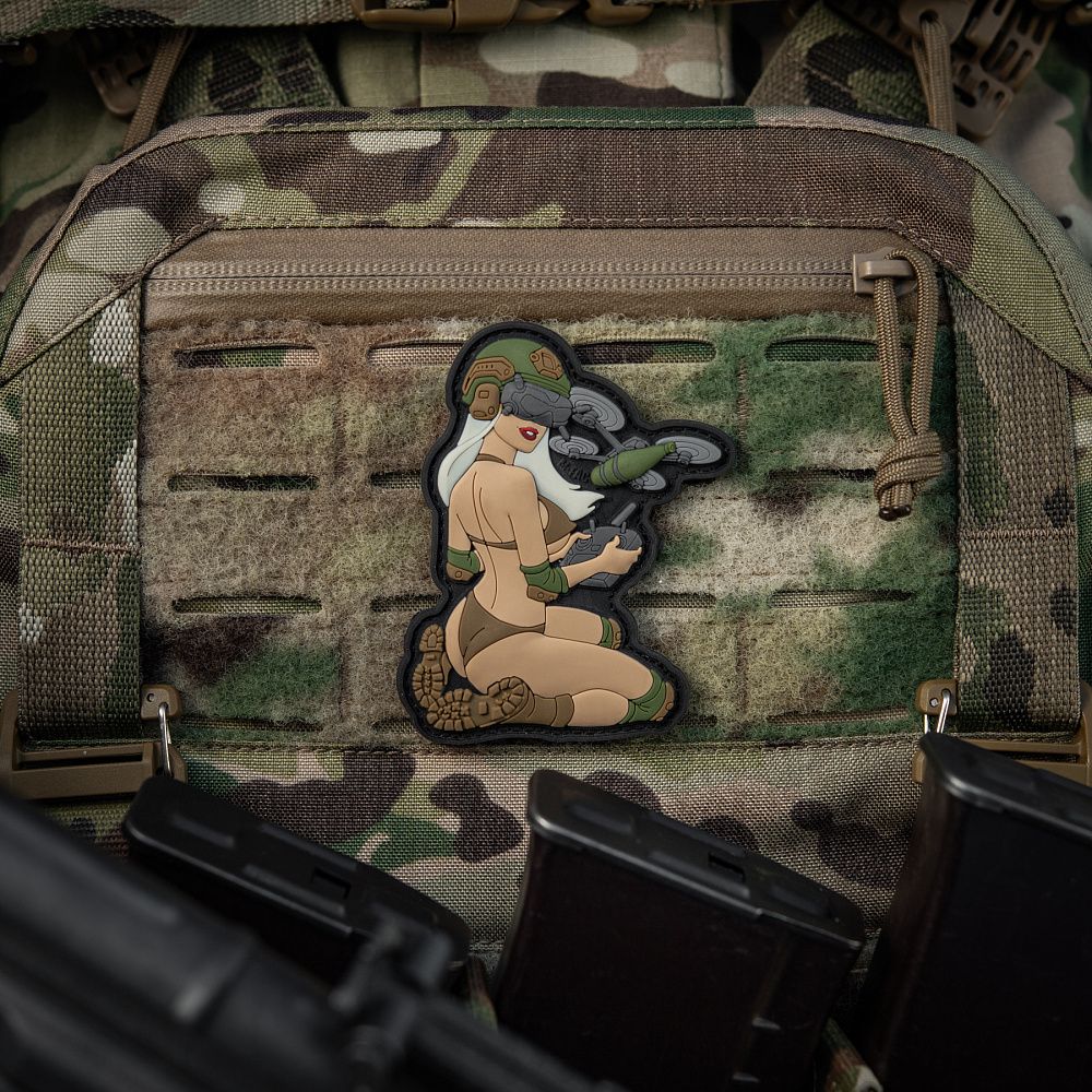 На патчі зображена кокетлива й надзвичайно приваблива дівчина в стилі Pin-Up, що випромінює красу та силу характеру. Вона впевнена та сильна, спокуслива й рішуче налаштована на знищення ворогів. Красуня в спеціальних окулярах майстерно управляє FPV дроном, який несе полум'яний "привіт" окупантам з неба. Операторка зі сталевою рішучістю та снайперською точністю продовжує ефективно знищувати ворожу техніку й живу силу противника.