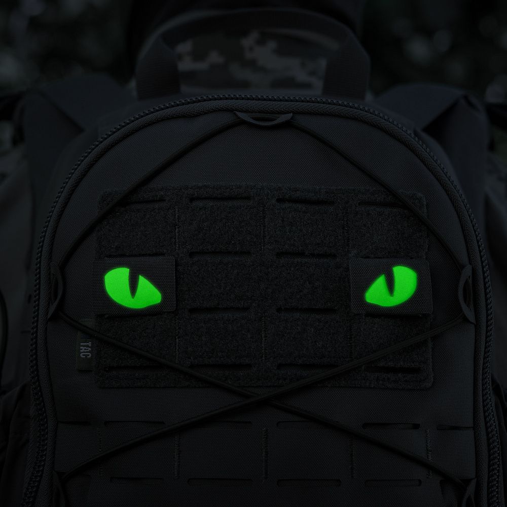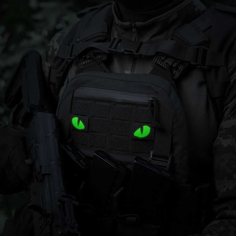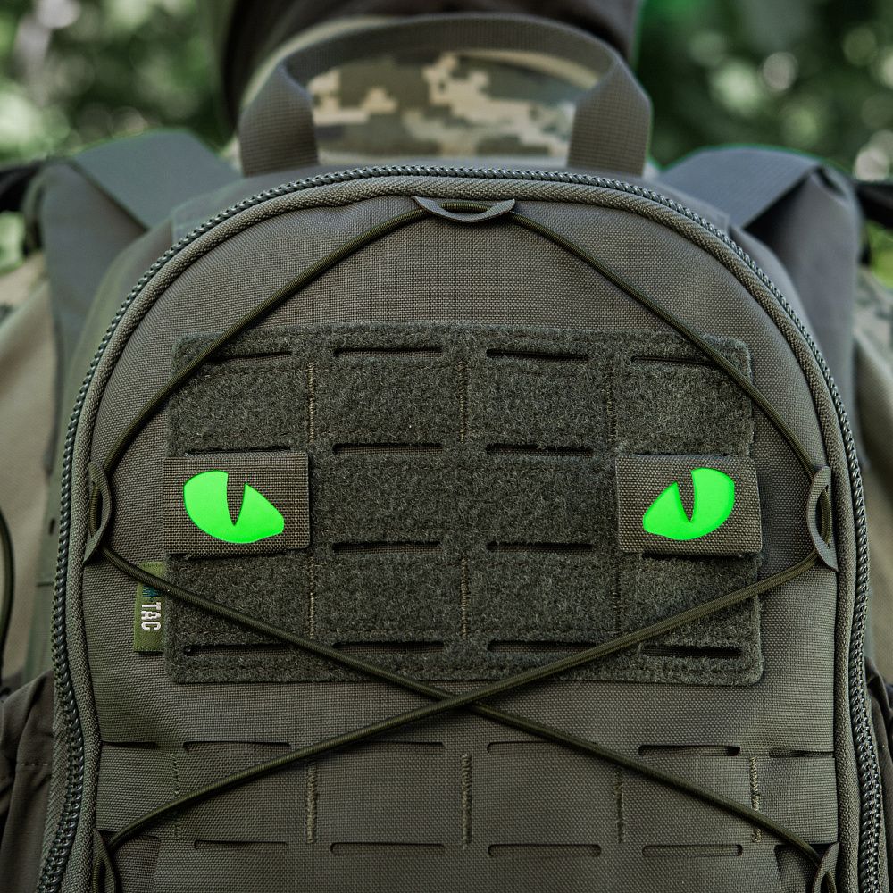 M-Tac нашивка Tiger eyes призначена для кріплення на MOLLE-стропах замість звичайної липучки. Зображення виконано зі світлонакопичувального матеріалу, що світиться в темряві.