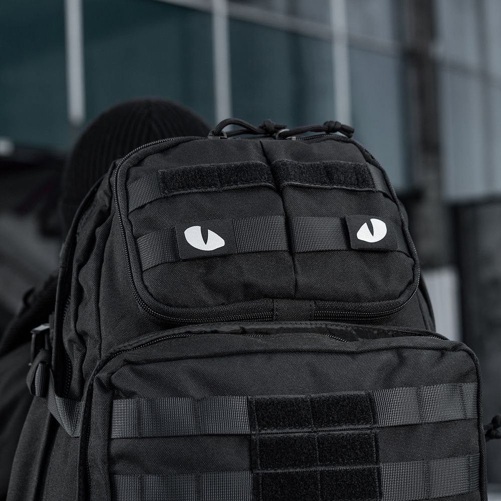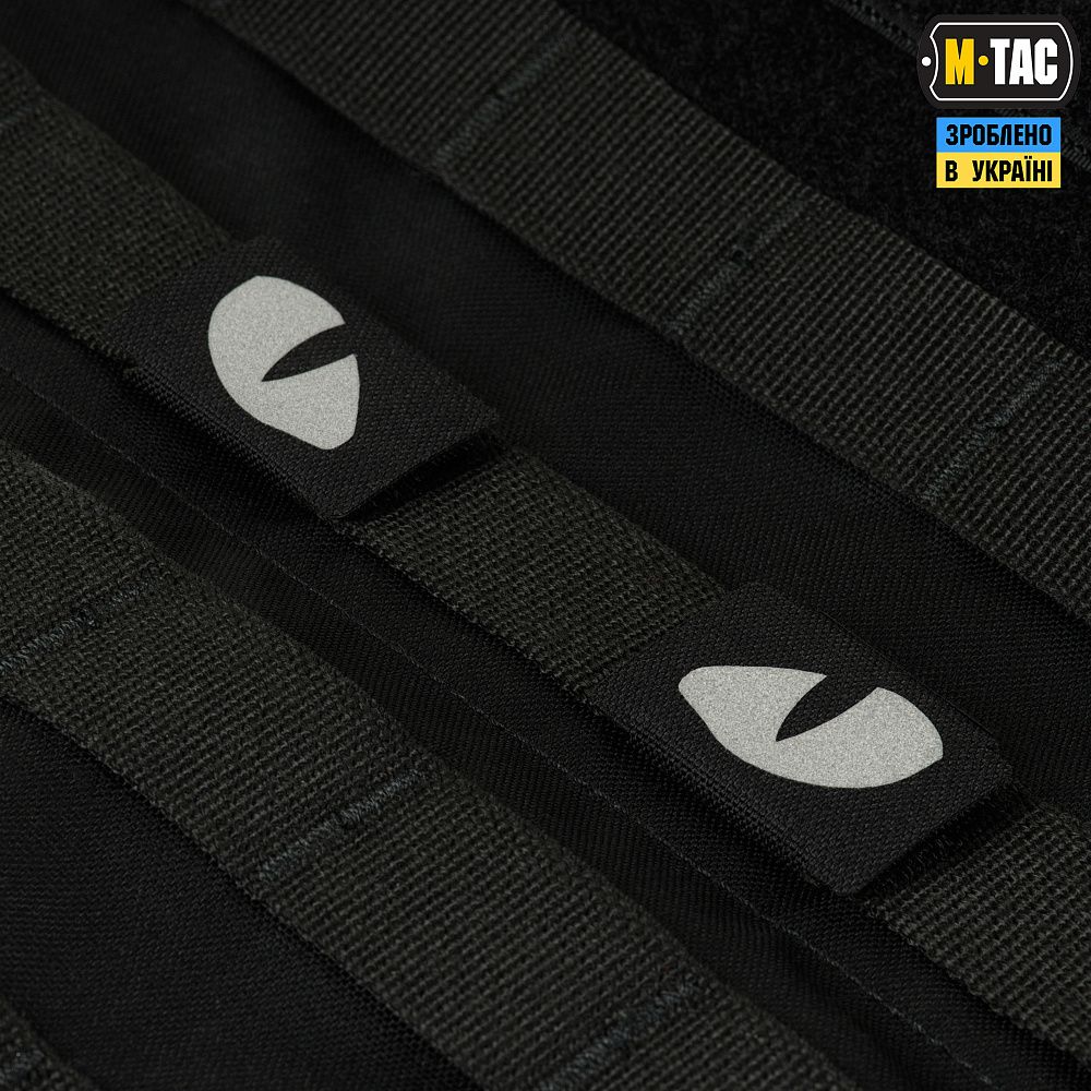 M-Tac нашивка Tiger Eyes складається з двох частин, що кріпляться на MOLLE-інтерфейс за допомогою велкро липучок. На патчі зображені очі тигра, які виглядають дуже реалістично, світяться в темноті та привертають увагу.