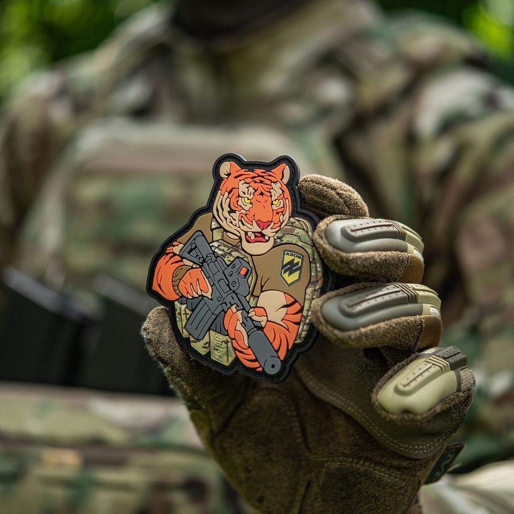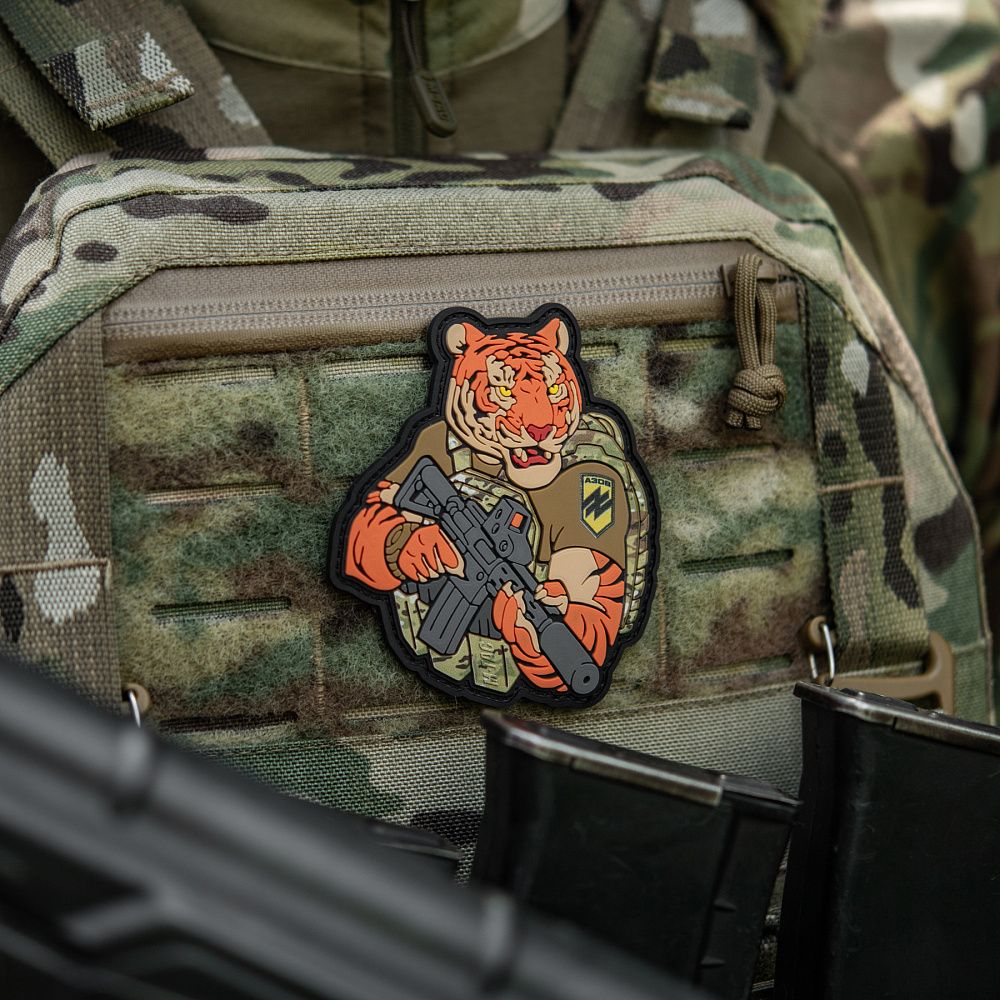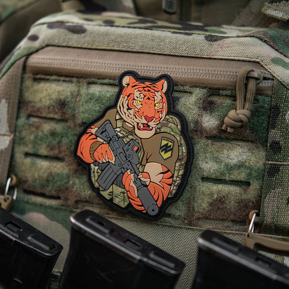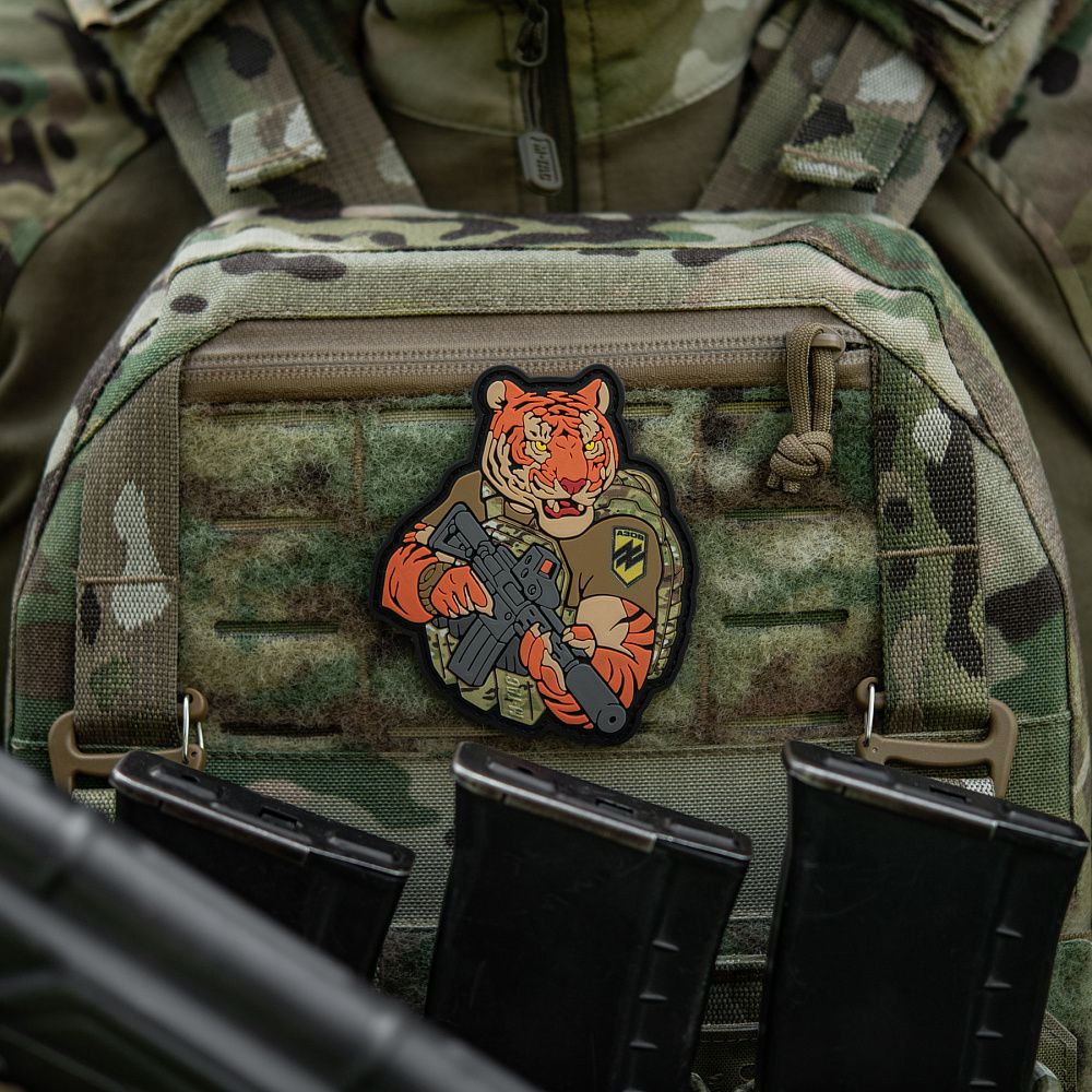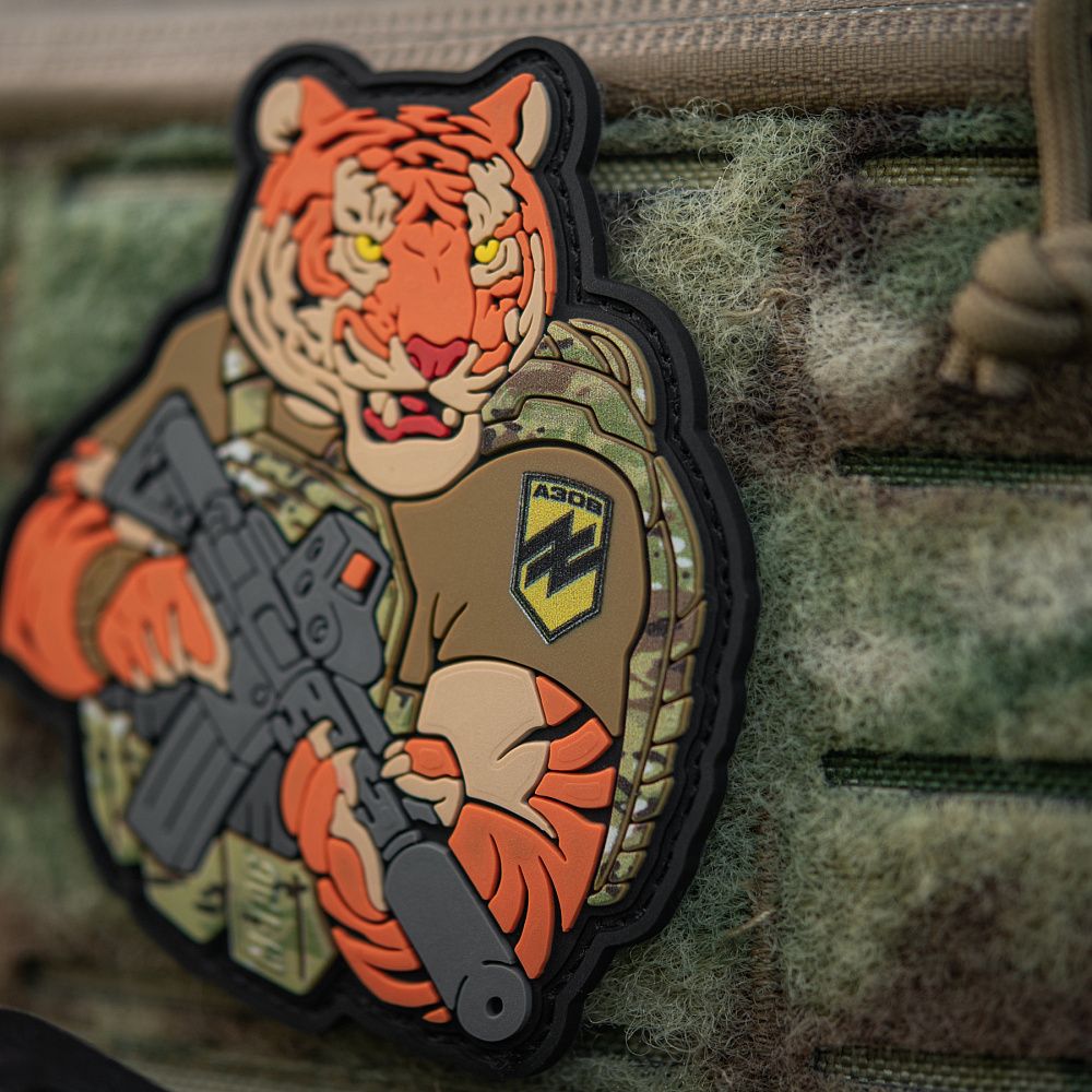 Надихнувшись войовничістю наших воїнів, бренд M-Tac випустив оригінальний мотиваційний патч, який присвячений справжнім бойовим тиграм з “Азову”. Тигр від M-Tac споряджений у плитоноску Cuirass QRS, а також у рейдовий рюкзак Sturm. На плечі тигра красується шеврон з логотипом бригади "Азов". Зброя нашого тигра не тільки кігті та ікла, в його лапах штурмова гвинтівка AR-15, що стоїть на озброєнні в багатьох країнах НАТО.