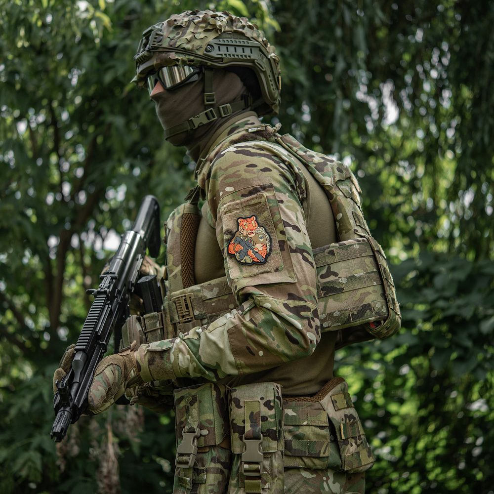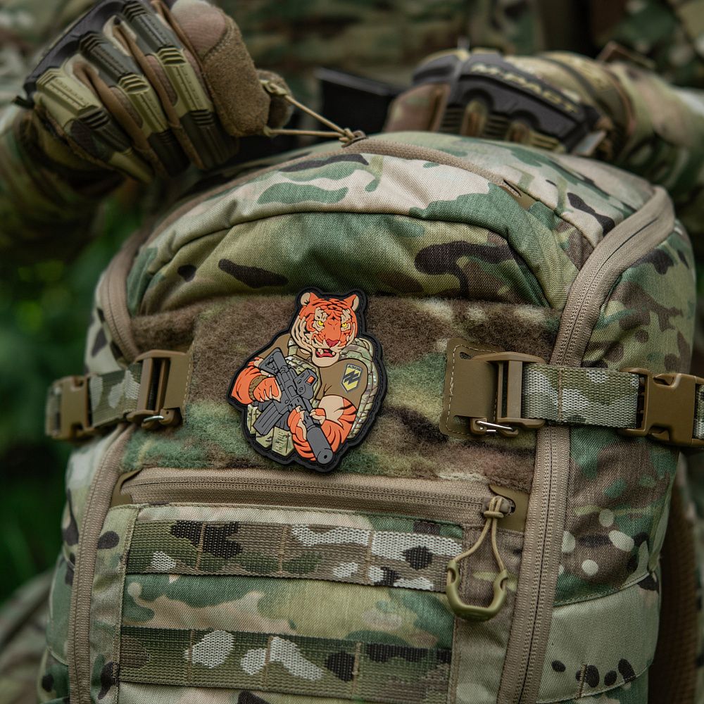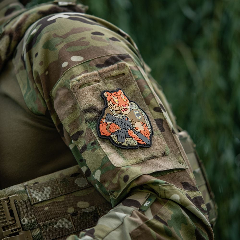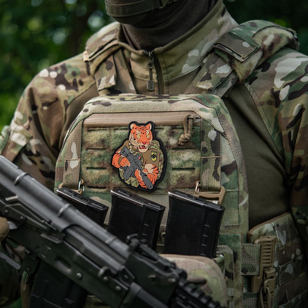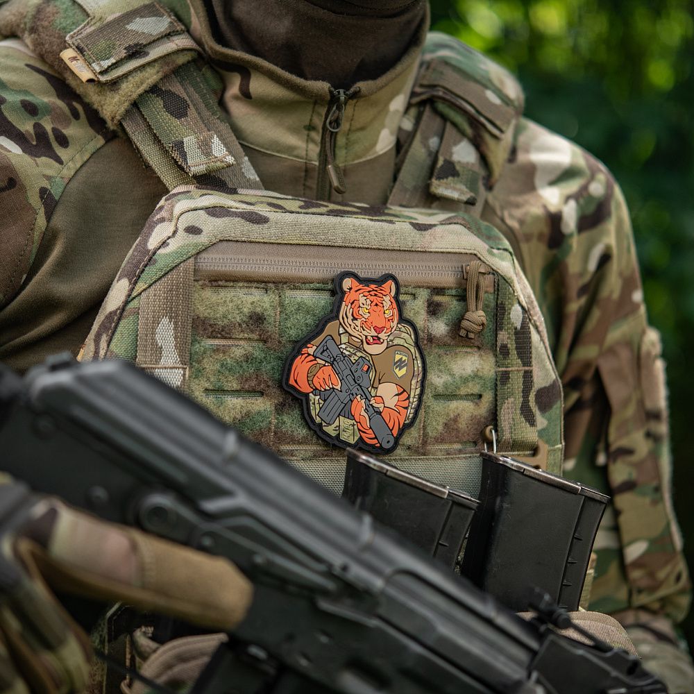 Надихнувшись войовничістю наших воїнів, бренд M-Tac випустив оригінальний мотиваційний патч, який присвячений справжнім бойовим тиграм з “Азову”. Тигр від M-Tac споряджений у плитоноску Cuirass QRS, а також у рейдовий рюкзак Sturm. На плечі тигра красується шеврон з логотипом бригади "Азов". Зброя нашого тигра не тільки кігті та ікла, в його лапах штурмова гвинтівка AR-15, що стоїть на озброєнні в багатьох країнах НАТО.