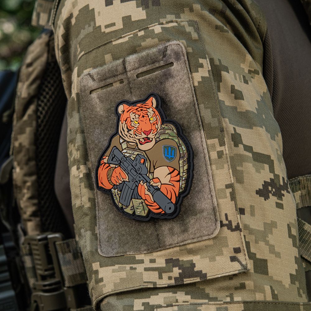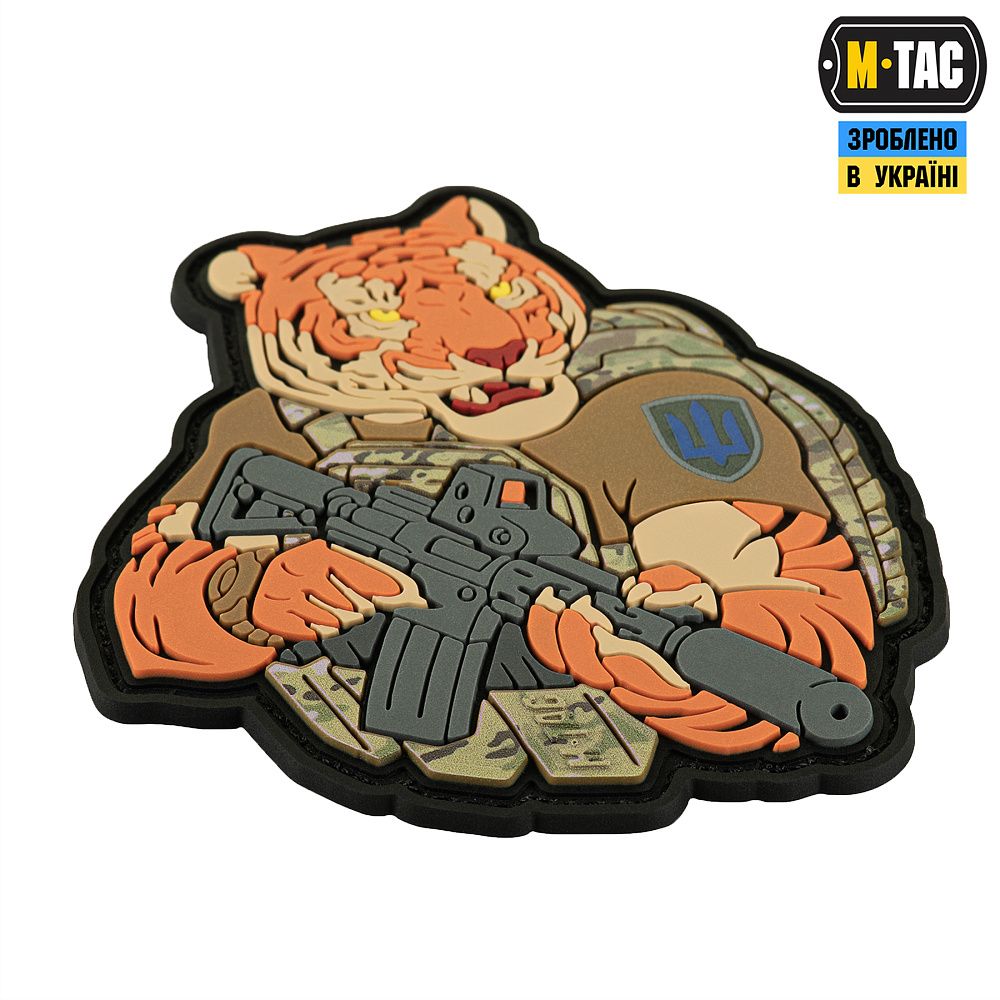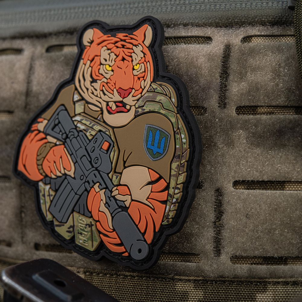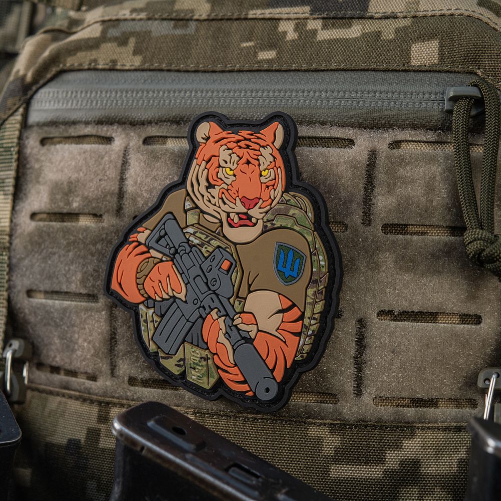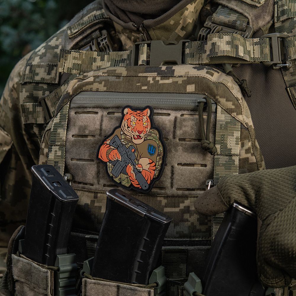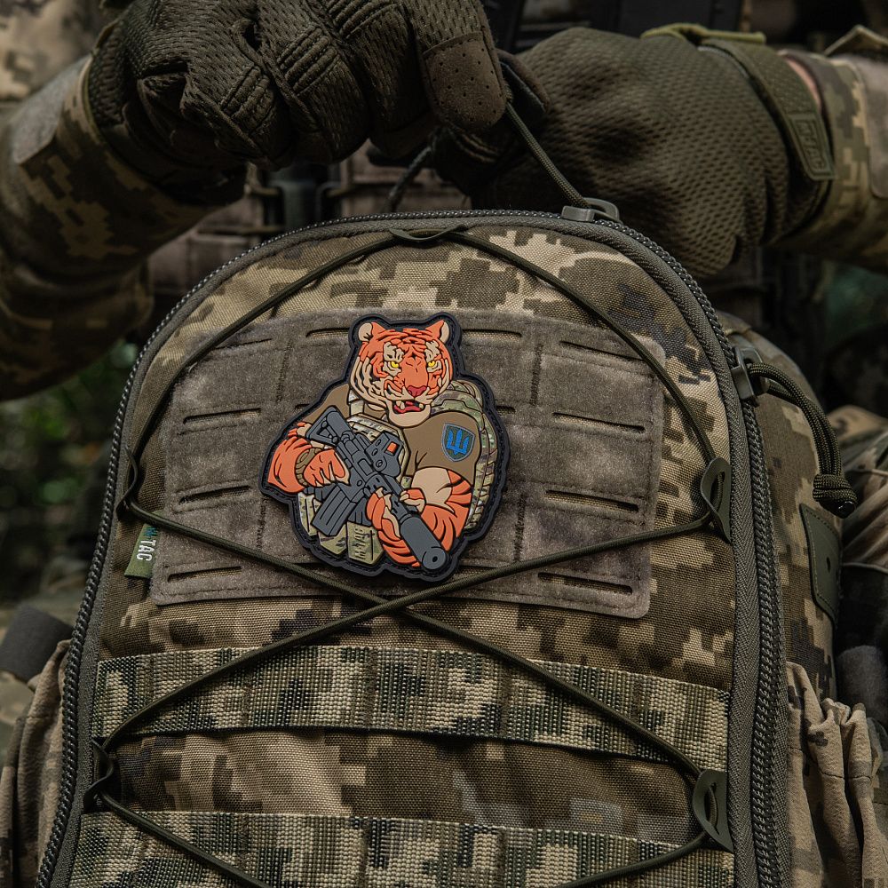 Тигр від M-Tac споряджений у плитоноску Cuirass QRS, а також у рейдовий рюкзак Sturm. На плечі тигра красується шеврон гірської піхоти. Зброя нашого тигра не тільки кігті та ікла, в його лапах штурмова гвинтівка AR-15, що стоїть на озброєнні в багатьох країнах НАТО.