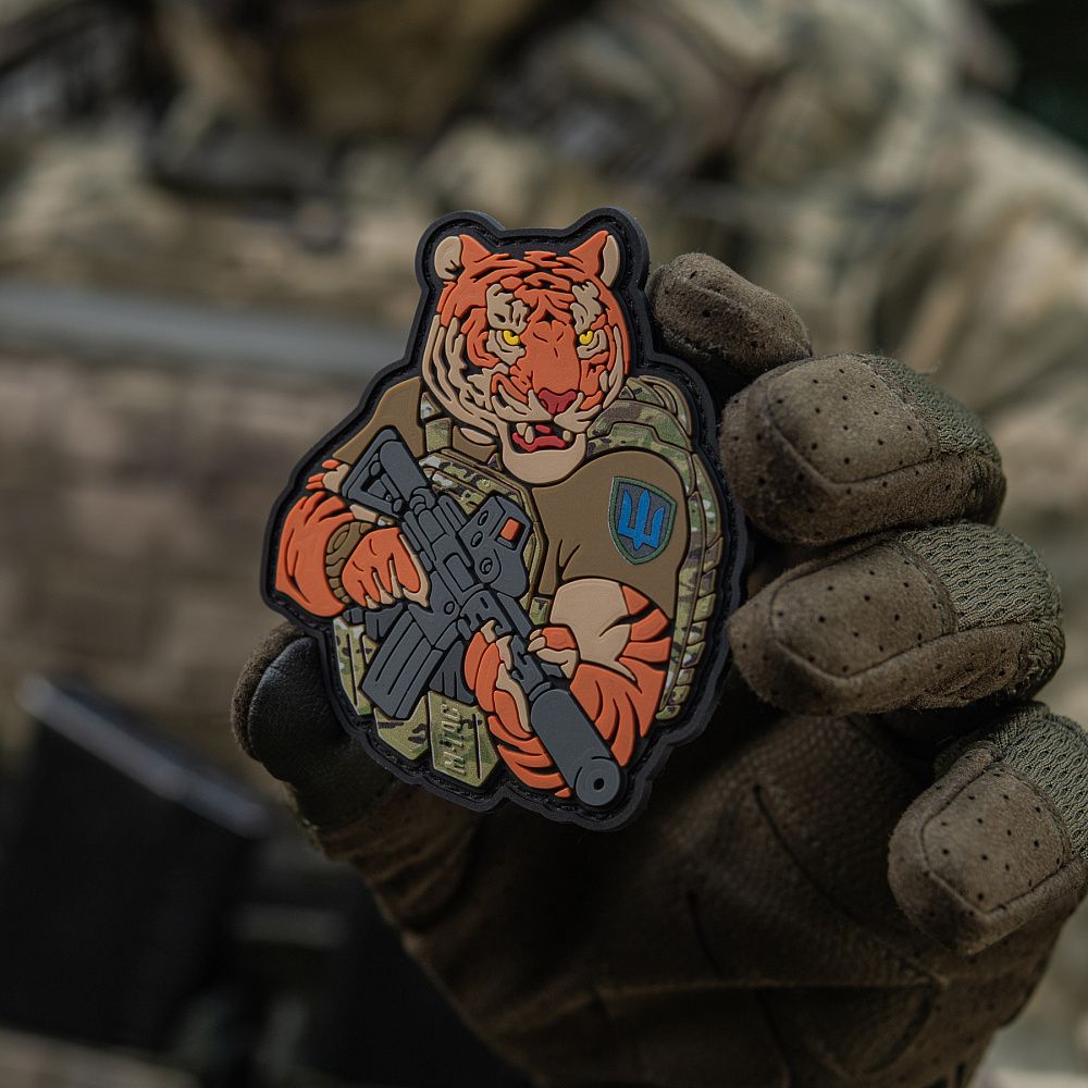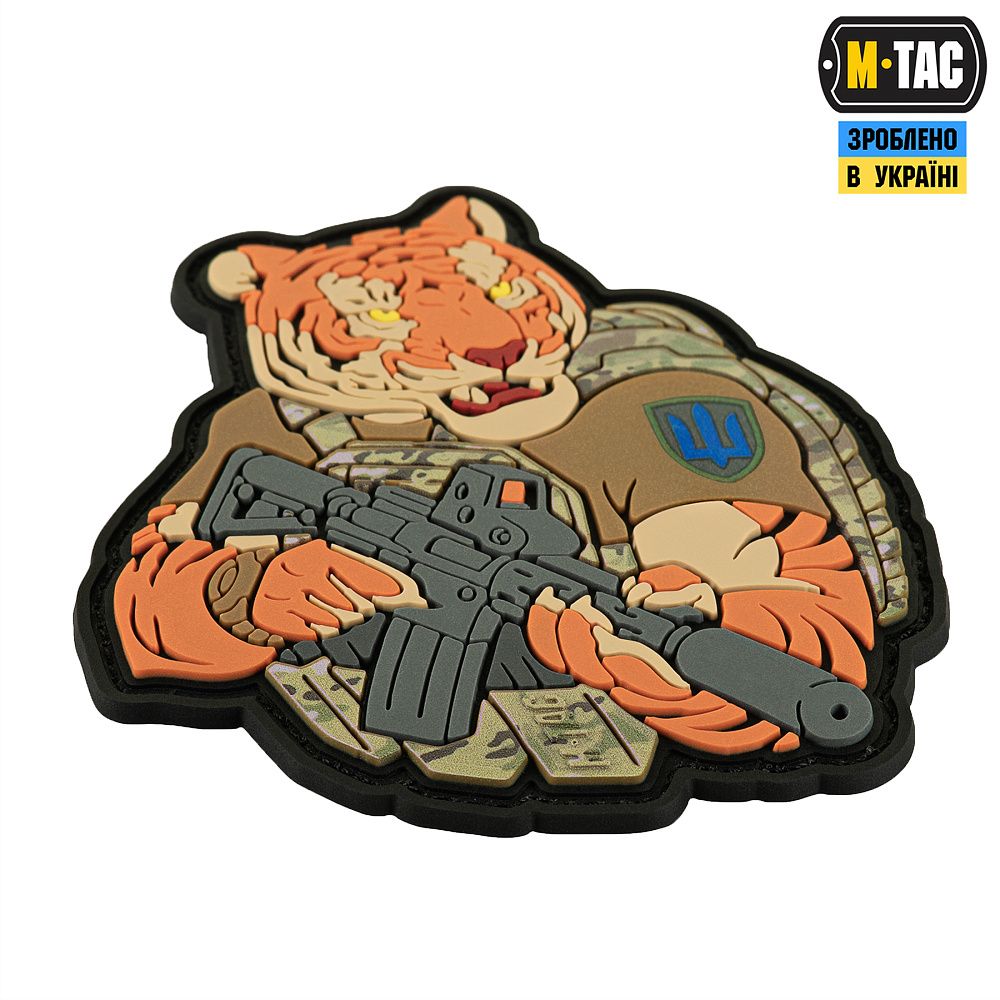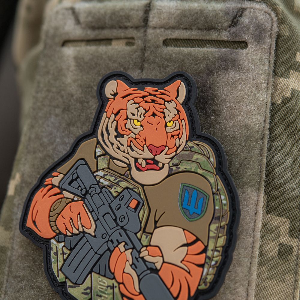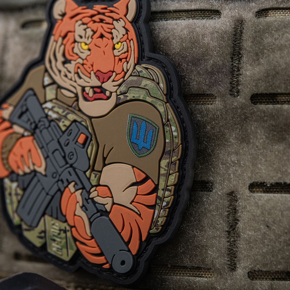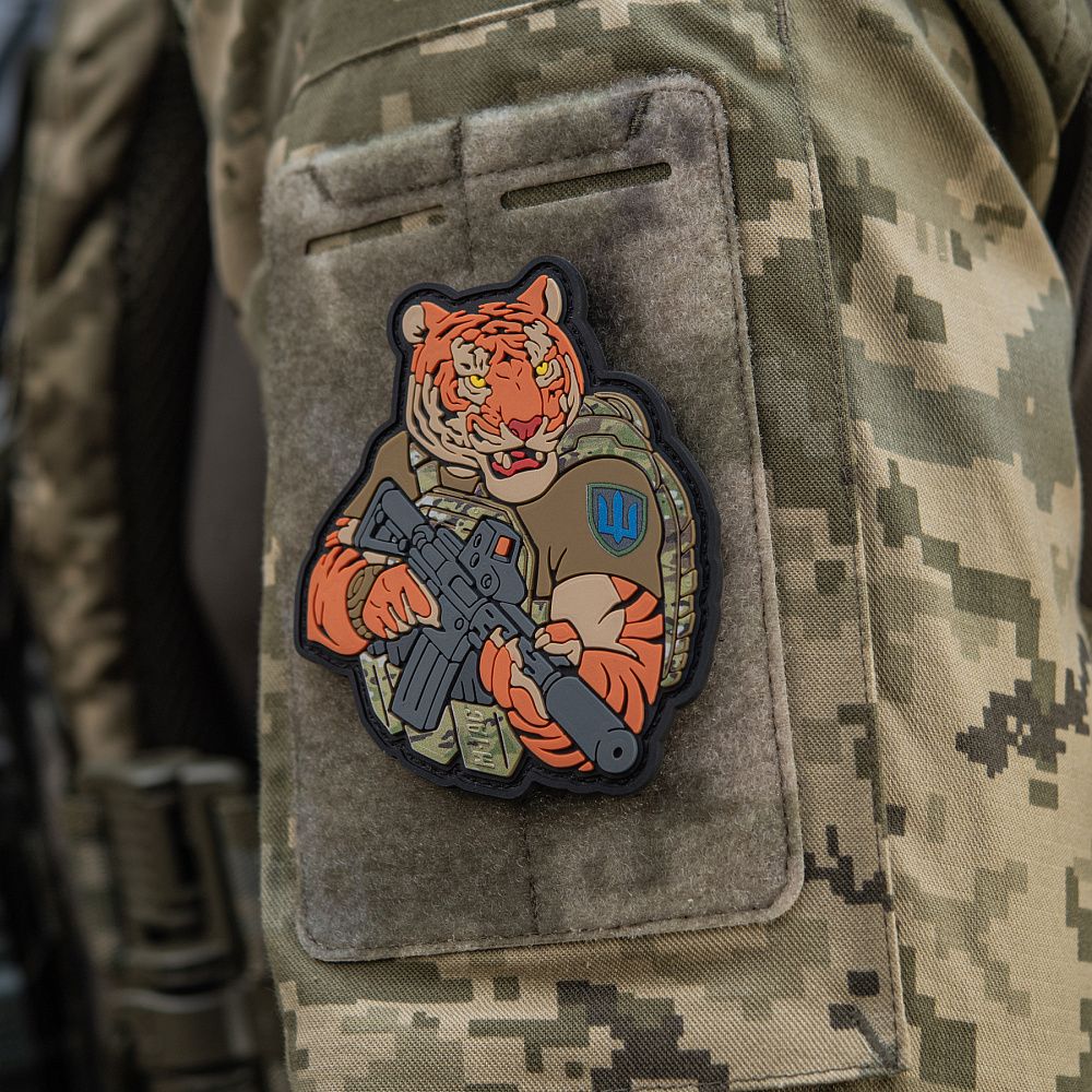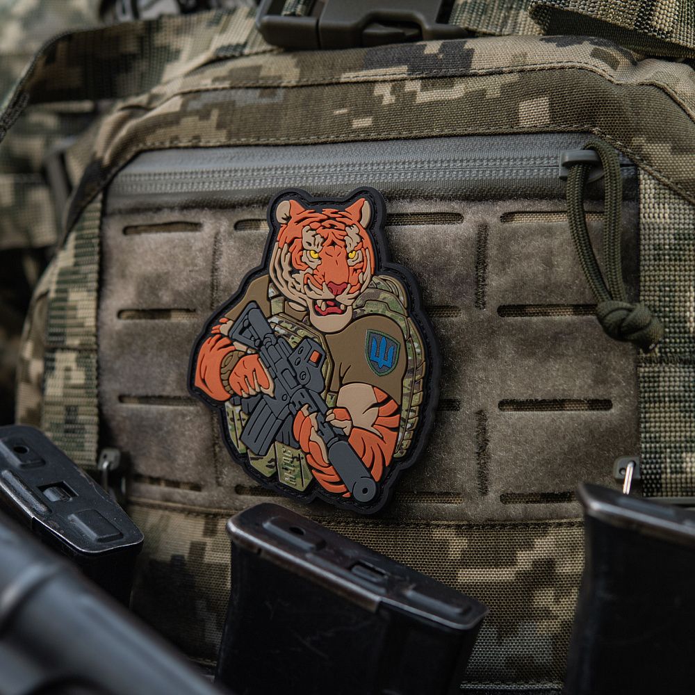 Тигр від M-Tac споряджений у плитоноску Cuirass QRS, а також у рейдовий рюкзак Sturm. На плечі тигра красується шеврон механізованих військ. Зброя нашого тигра не тільки кігті та ікла, в його лапах штурмова гвинтівка AR-15, що стоїть на озброєнні в багатьох країнах НАТО.