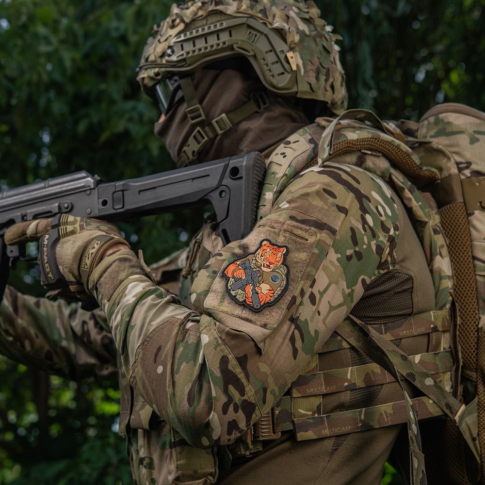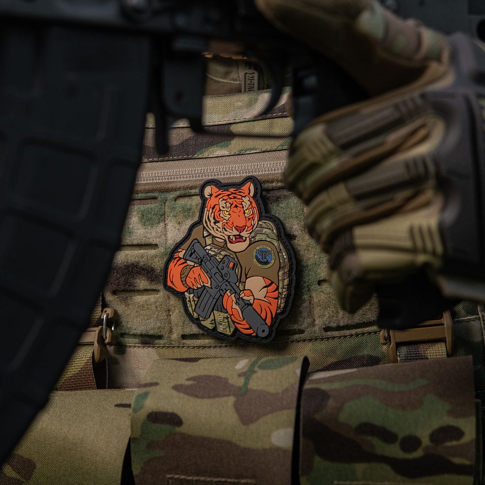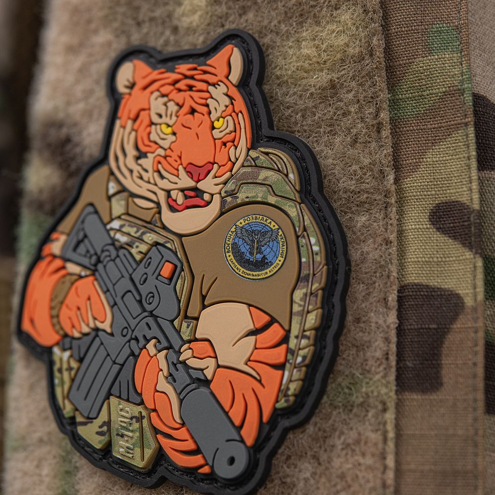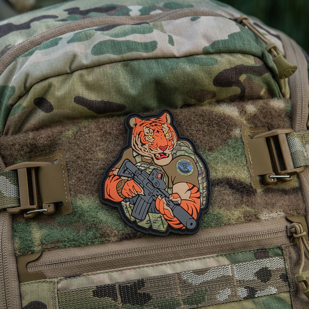Тигр від M-Tac споряджений у плитоноску Cuirass QRS, а також у рейдовий рюкзак Sturm. На плечі тигра красується шеврон воєнної розвідки. Зброя нашого тигра не тільки кігті та ікла, в його лапах штурмова гвинтівка AR-15, що стоїть на озброєнні в багатьох країнах НАТО.