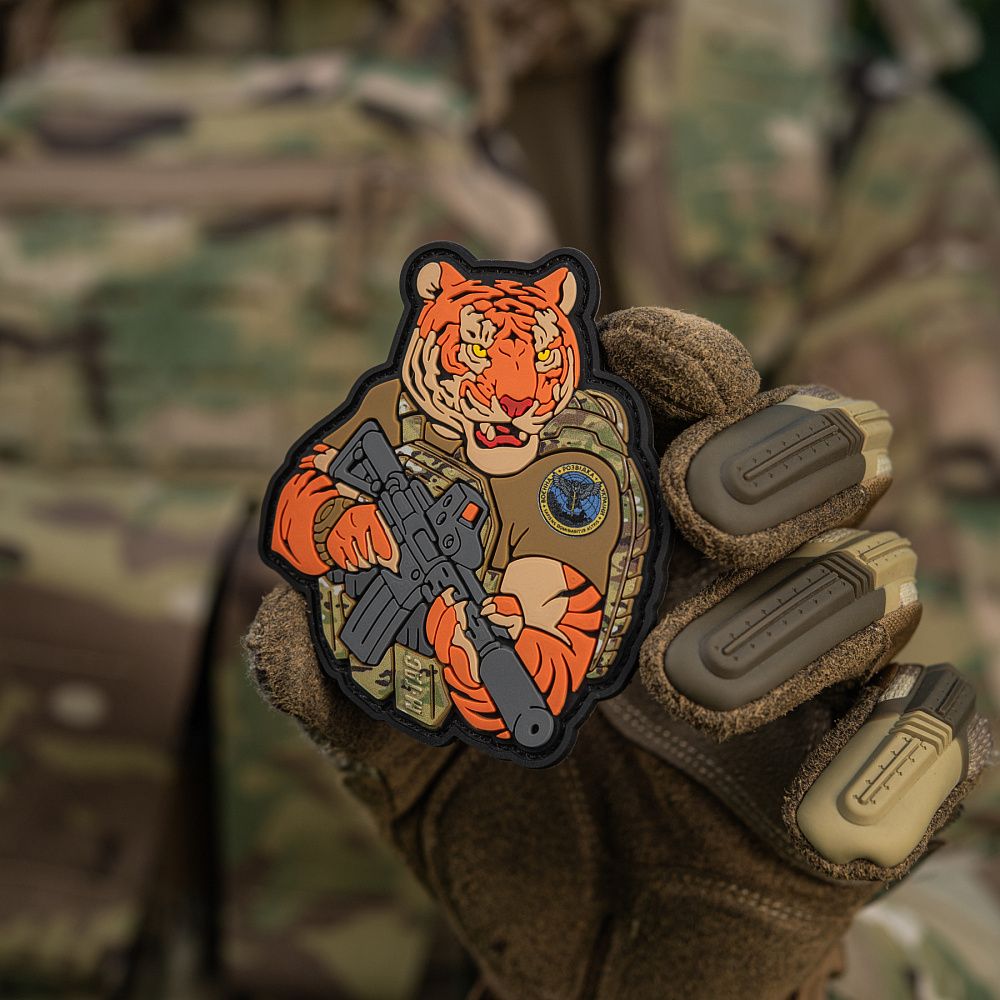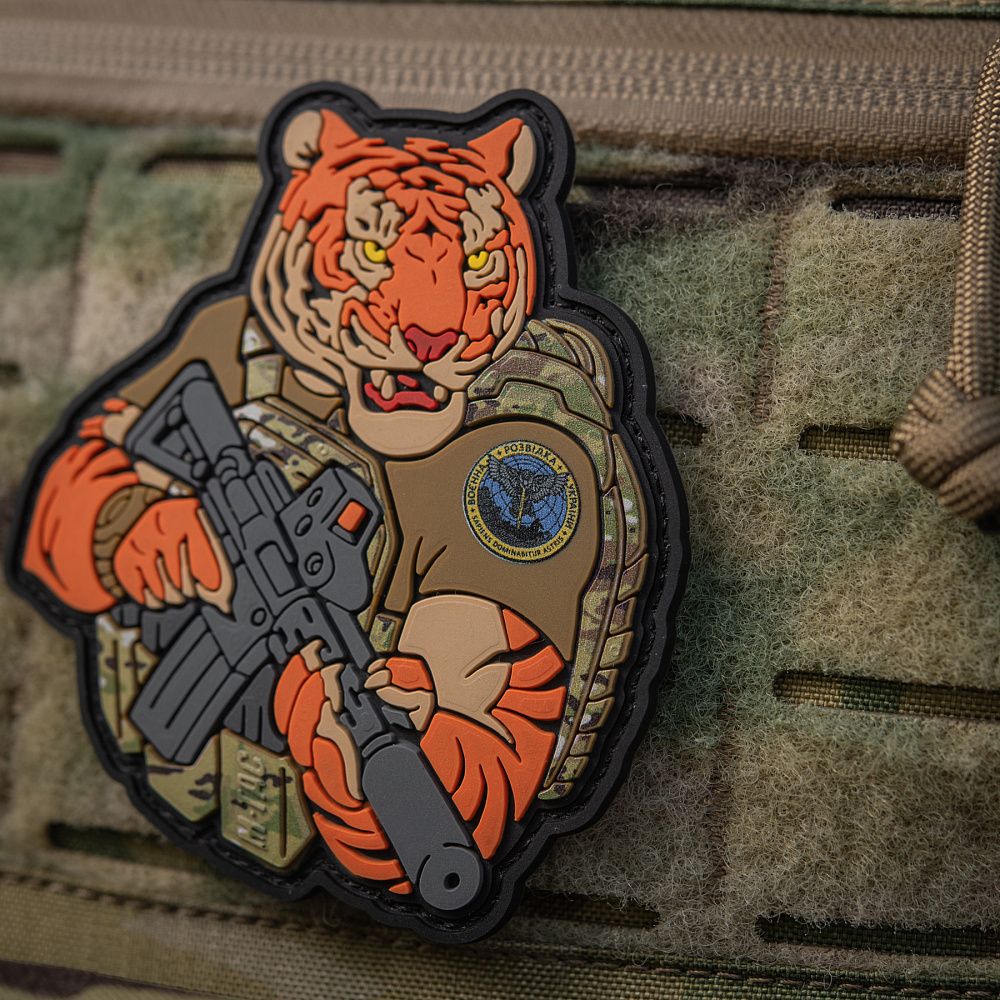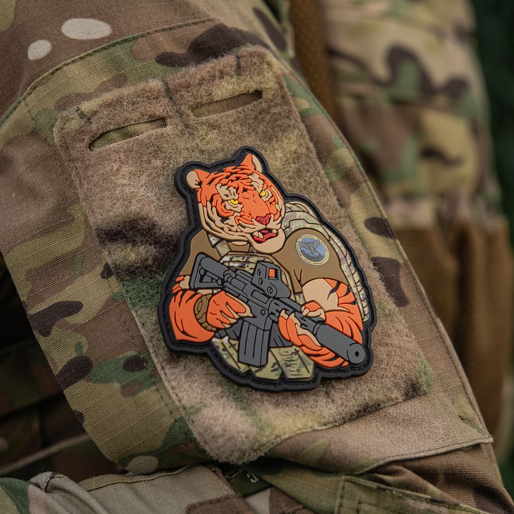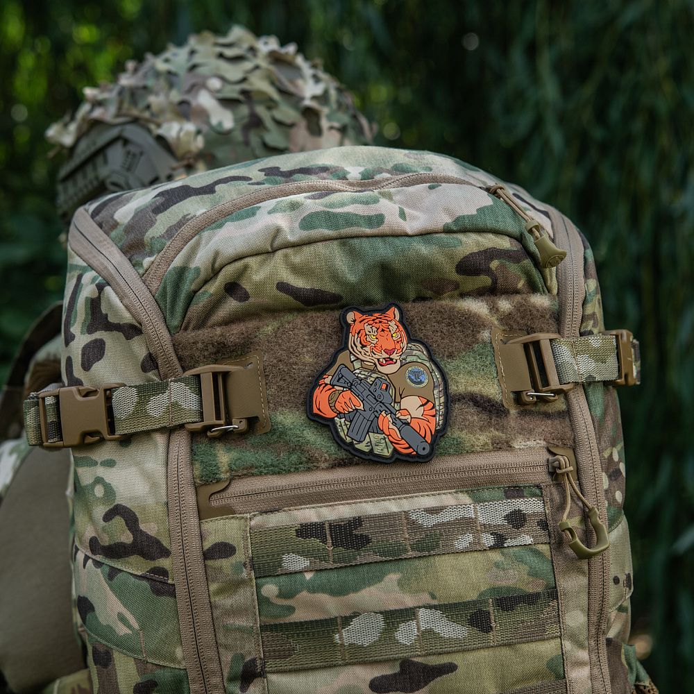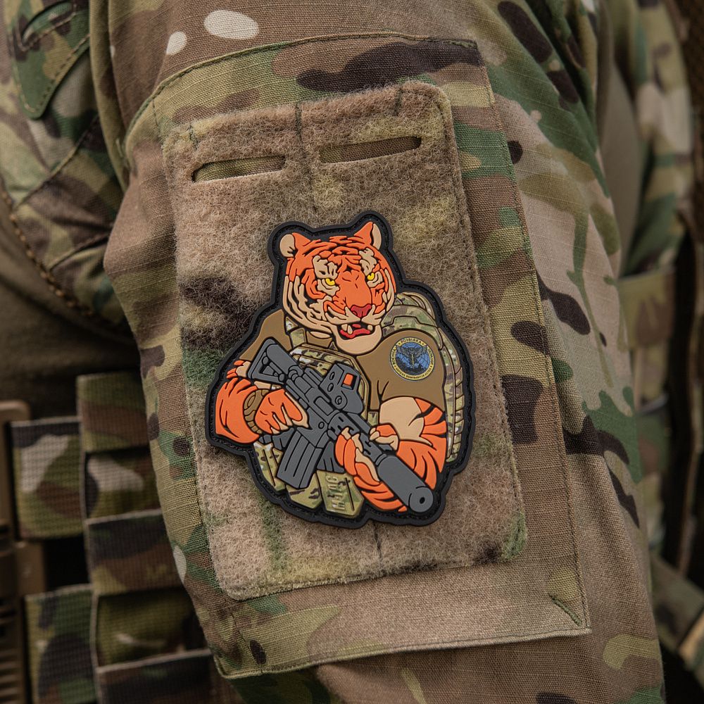 Тигр від M-Tac споряджений у плитоноску Cuirass QRS, а також у рейдовий рюкзак Sturm. На плечі тигра красується шеврон воєнної розвідки. Зброя нашого тигра не тільки кігті та ікла, в його лапах штурмова гвинтівка AR-15, що стоїть на озброєнні в багатьох країнах НАТО.
