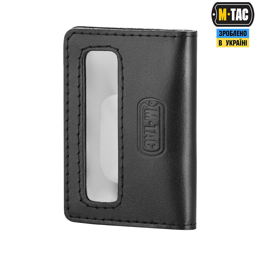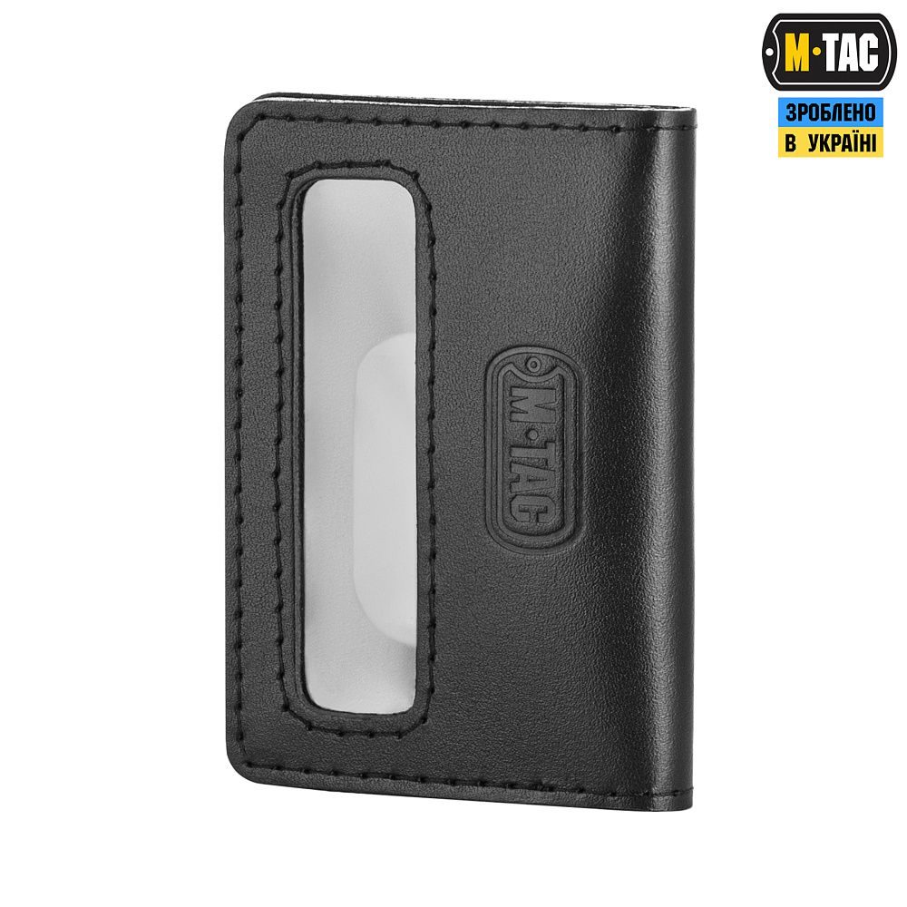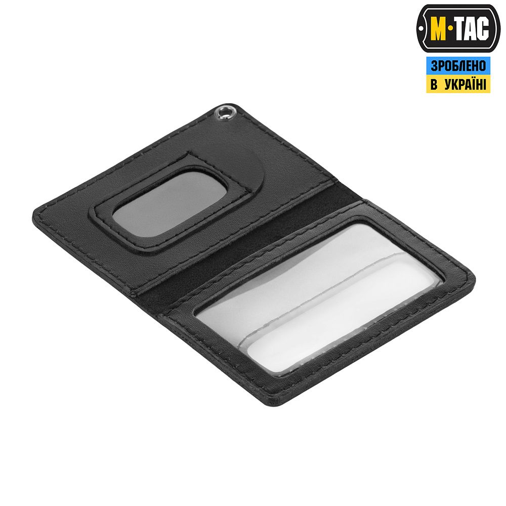 Обработка изготовлена из натуральных шкіри – міцного, носостійкого и прочного материала. Оснащена двумя отделениями: прозорим для разметки идентификатора, выделенного та шкіряним, поверхность которого нашитий видсик для жетона.
