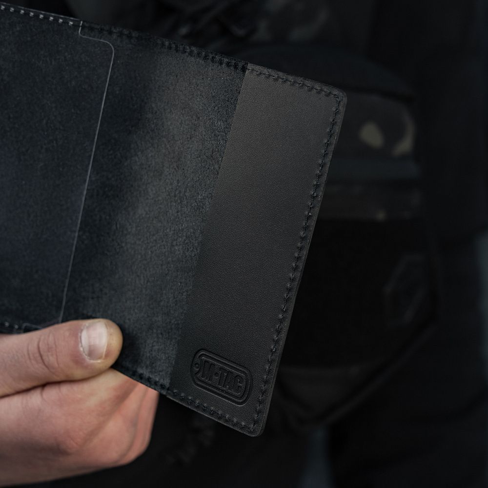 Обкладинка виготовлена з натуральної шкіри. Цей матеріал, часто використовується для виготовлення гаманців, обкладинок та картхолдерів, адже володіє винятковою стійкістю до стирання, міцністю та довговічністю. Метод нанесення малюнків та написів - тиснення.
