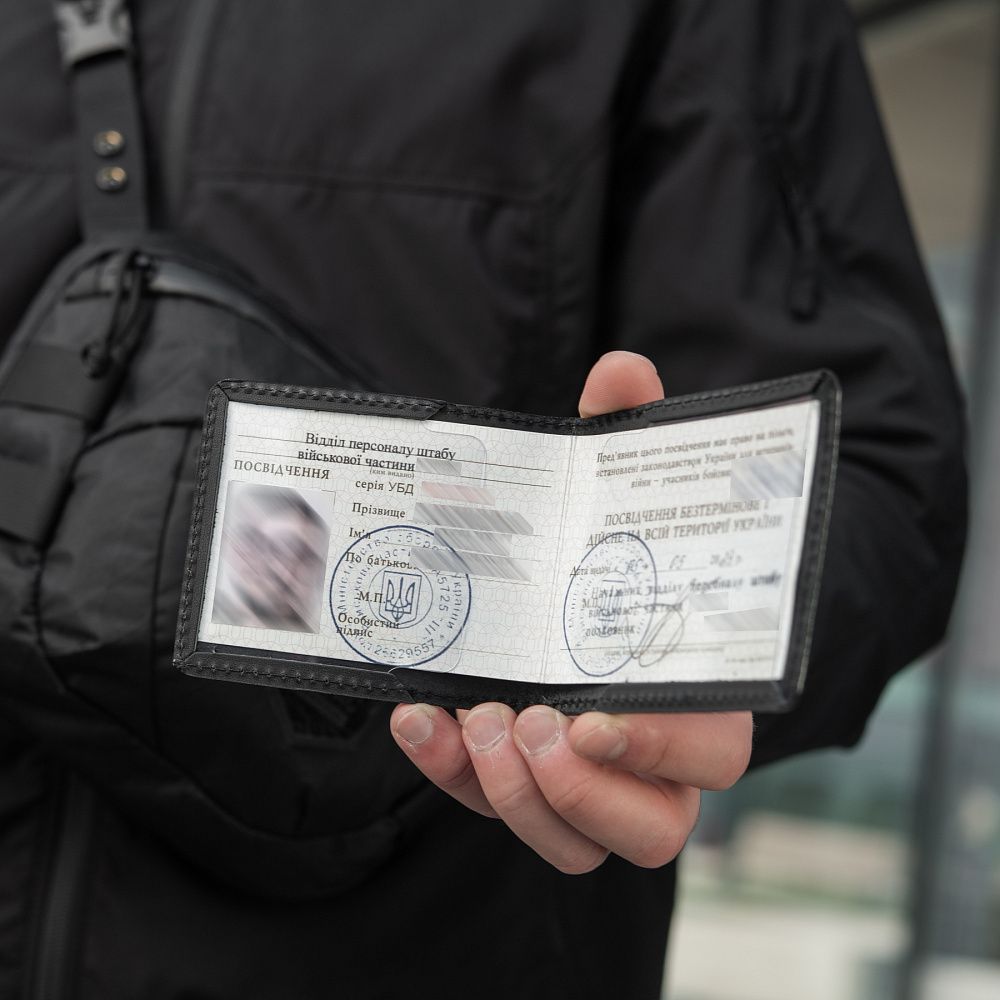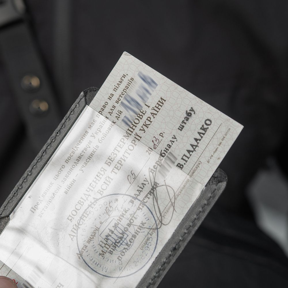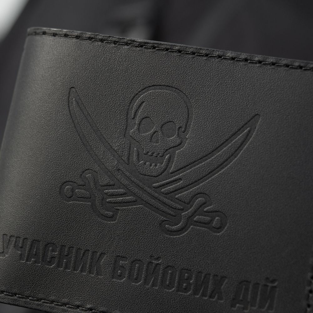 На фронтальній частині обкладинки розташований напис “Учасник бойових дій”, а також зображення Веселого Роджера, яке символізуватиме вашу готовність з головою зануритись у хвилі пригод й безстрашно долати всі життєві шторми. Всередині обкладинки передбачені прозорі відсіки для зручного розміщення вашого посвідчення.