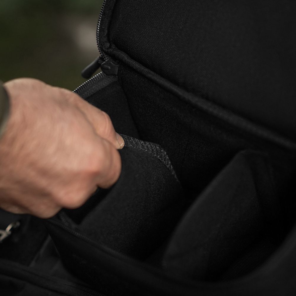 На передній частині органайзера розташована велкро-панель, призначена для кріплення ідентифікаторів та патчів. Органайзер розстібається за принципом валізи, завдяки двом застібкам-блискавкам. Для зручності перенесення на верхній частині органайзера розташована пом’якшена ручка.