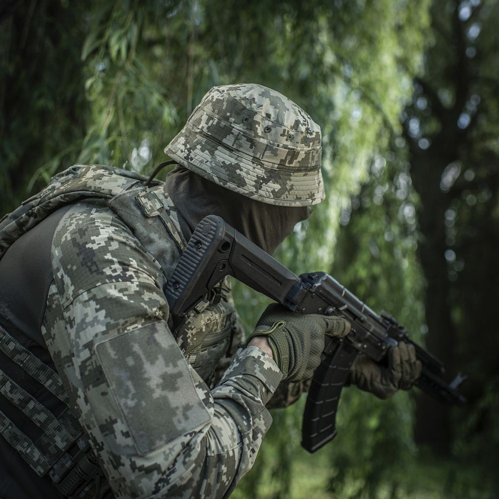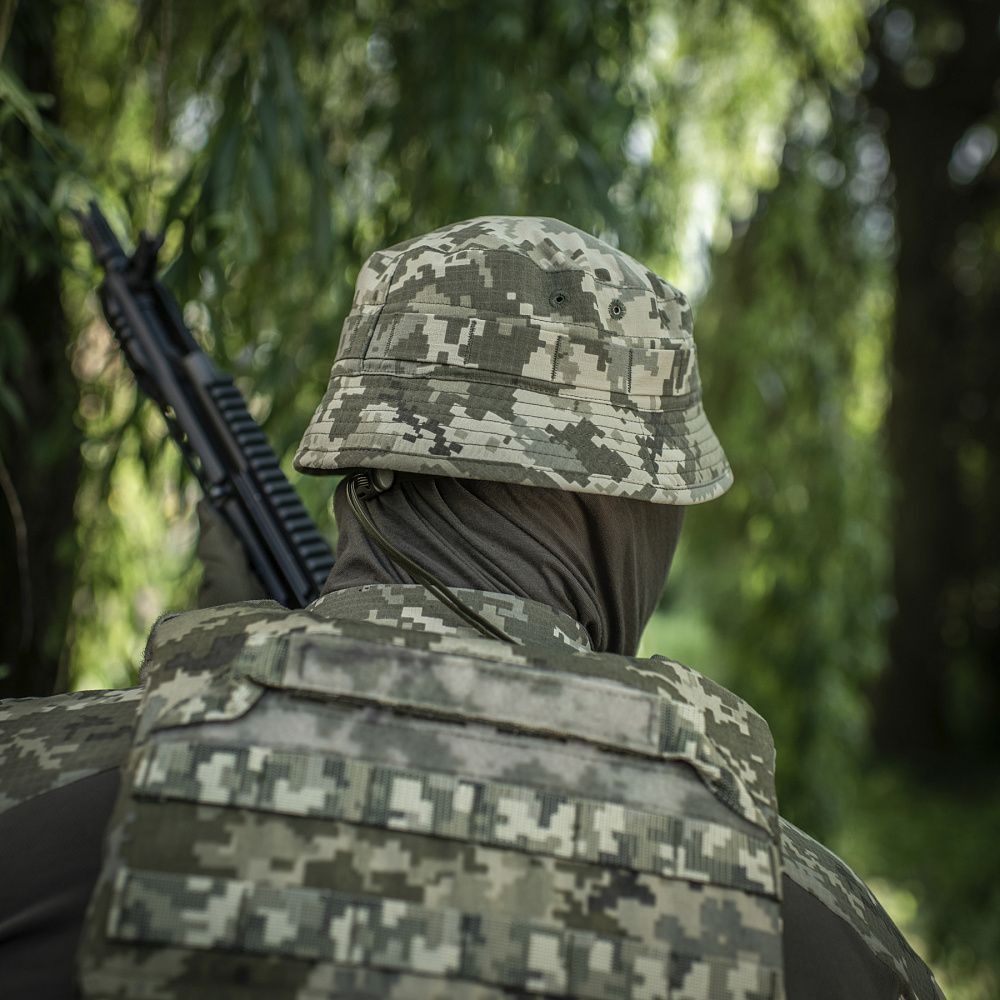 Особливості:особливий крій з короткими напівжорсткими полями; Molle інтерфейс для кріплення додаткових засобів маскування; спеціальний шнур, що не дозволить панамі злетіти з голови.
