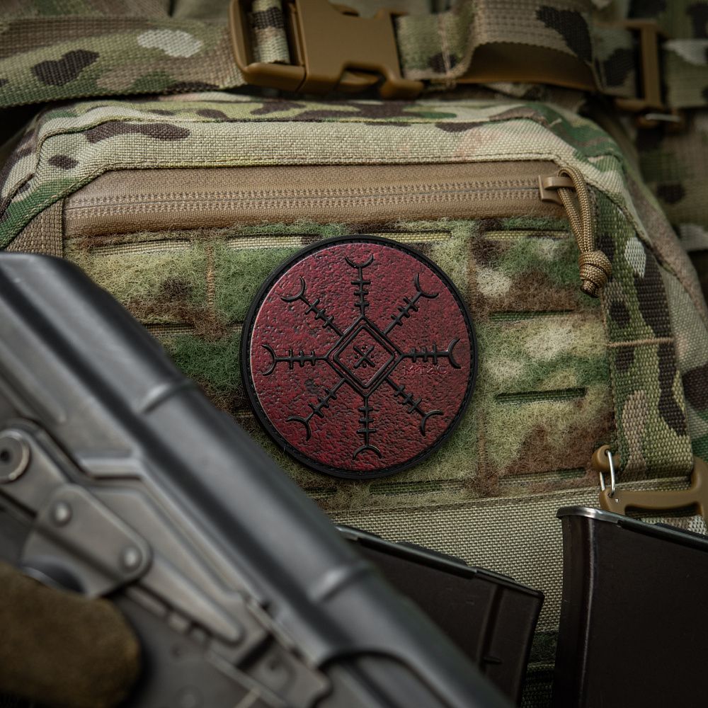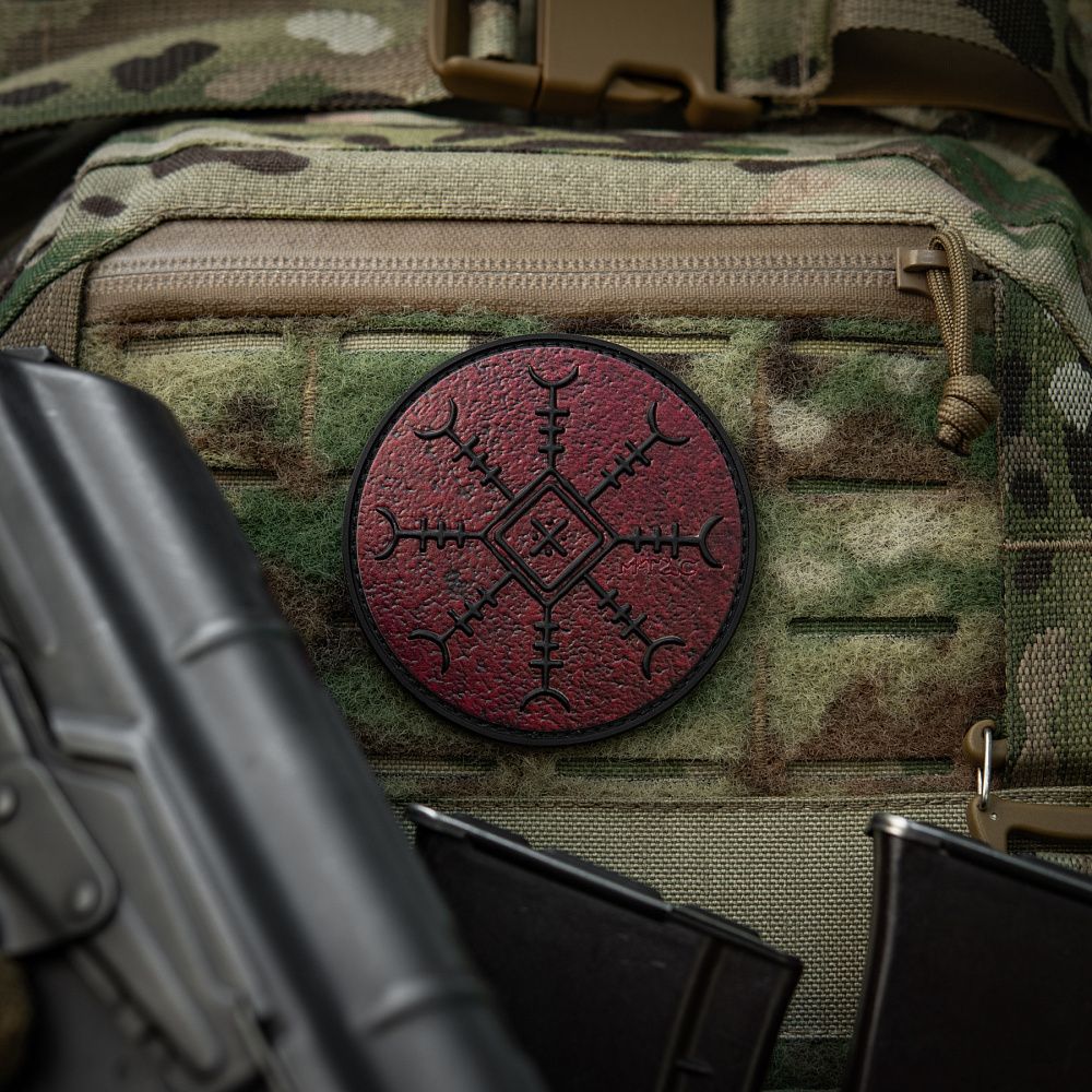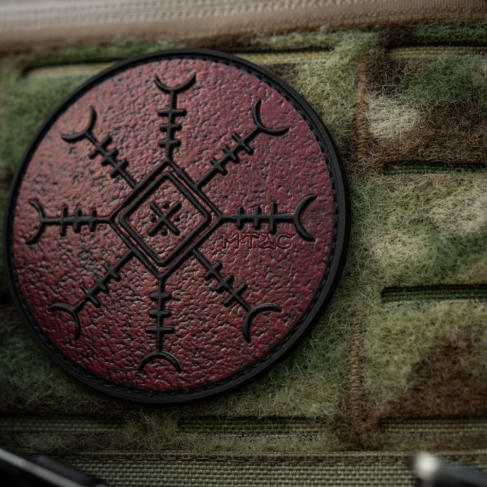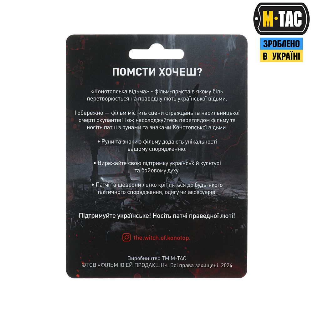 Патч КОНОТОПСЬКИЙ ОБЕРІГ - це колаборація фільму-помсти «Конотопська Відьма» студії FILM.UA і бренду М-Тас. Цей спеціально розроблений для фільму символ поєднує силу Конотопської Відьми, руну “Шолом жаху” та елементи вишивки Сумського регіону, найбільш притаманні Конотопу. “Шолом жаху” вважається одним з найсильніших символів захисту воїна, охороняючи його з усіх восьми сторін. Символ також покликаний навіювати страх на ворогів, змушувати їх до втечі.