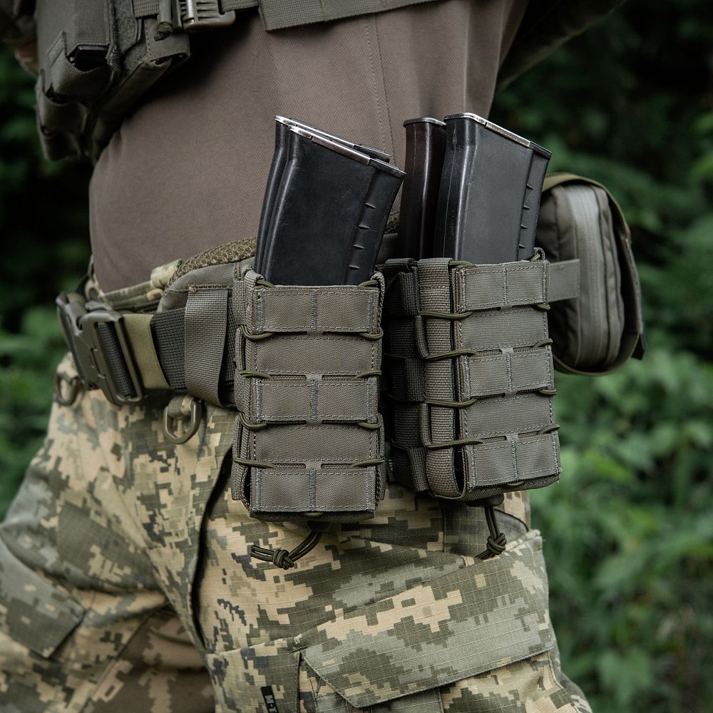 Підсумок дає можливість розмістити два магазини типу AR чи АК. Продумана форма забезпечує надійну фіксацію всередині та захищає магазини від мимовільного випадання при активних рухах. Фронтальний MOLLE інтерфейс виготовлений по технології Laser Cut та дозволяє прикріпити додаткове спорядження. Бокові стінки з нейлонової стропи забезпечують легке виймання магазинів з підсумка.